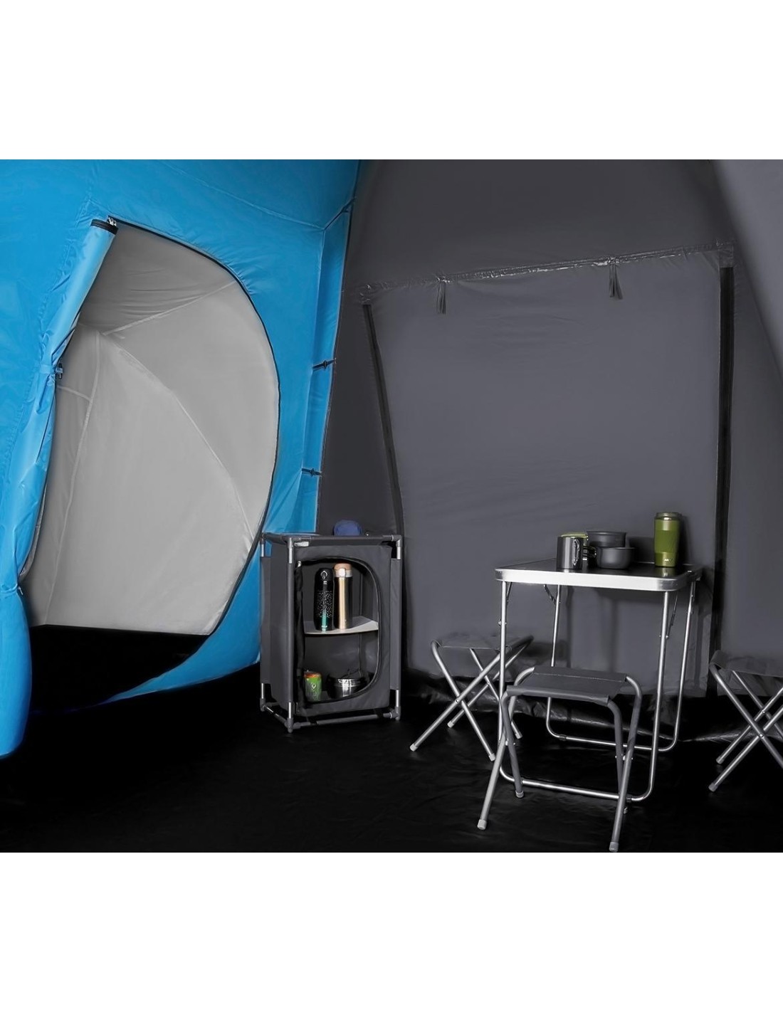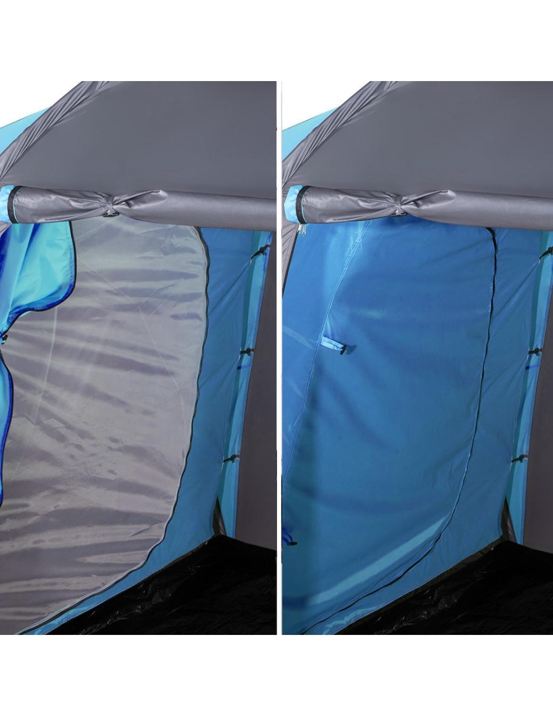 The tent is based on four fiberglass frames that are integrated with the flysheet. Tunnels and frames are marked with the same color so it is easy to match the right frame to the tunnel. Thanks to special holders two independent bedrooms can be installed inside the tent. The entire tent is secured by pegs, together with the cords that fasten the flysheet.
