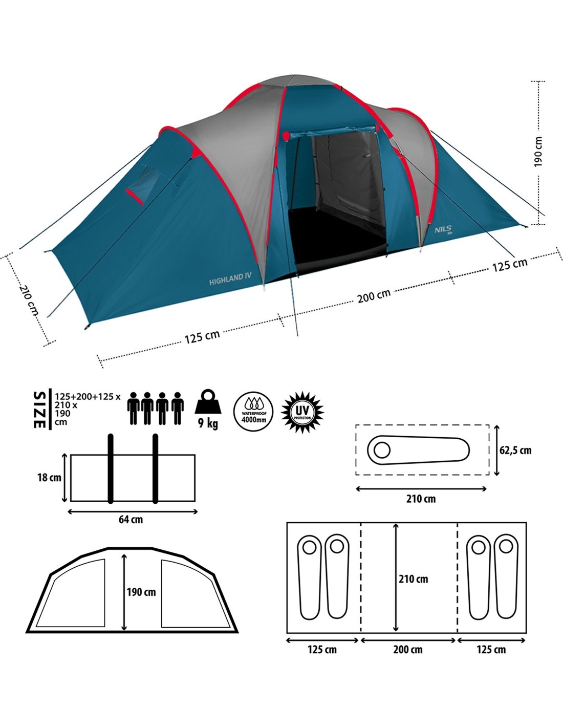 Nils Camp NC6431 Highland IV is the perfect choice for those who love weekend trips to the lake, family vacations in a tent or summer camping in the woods. The Highland IV is a smaller version of the popular NC6031 Highland tent, tailored to the needs of a group of four. With two separate double bedrooms and a spacious vestibule with a floor, it offers a high level of comfort and functionality, even in changeable weather.