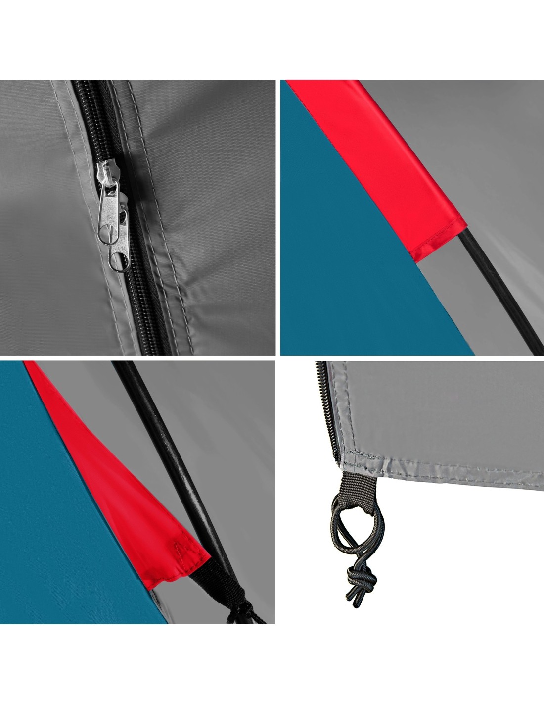 The tent has four fiberglass poles which are attached to the rain fly. The poles are color-coded to make assembly quick and easy. The two bedrooms are attached to the inside of the rain fly with straps. Tensioning ropes and pegs ensure the stability of the structure.