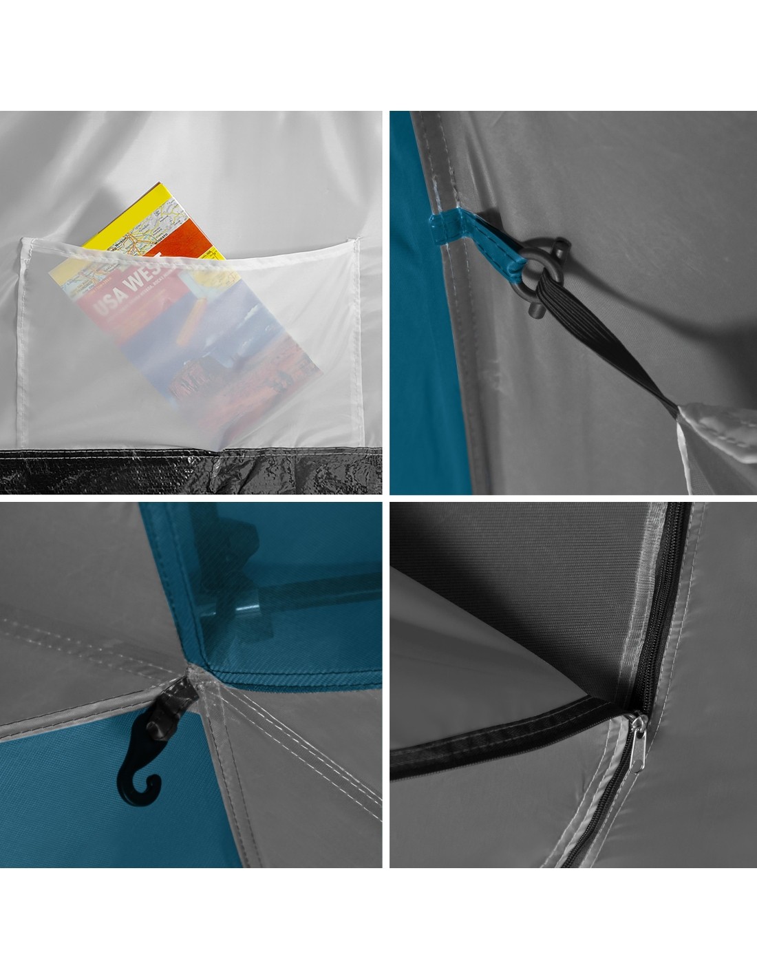 Four inner pockets allow you to keep your small items organized. In addition, two holders on the ceiling allow you to hang lighting, making evenings in the tent even more enjoyable.