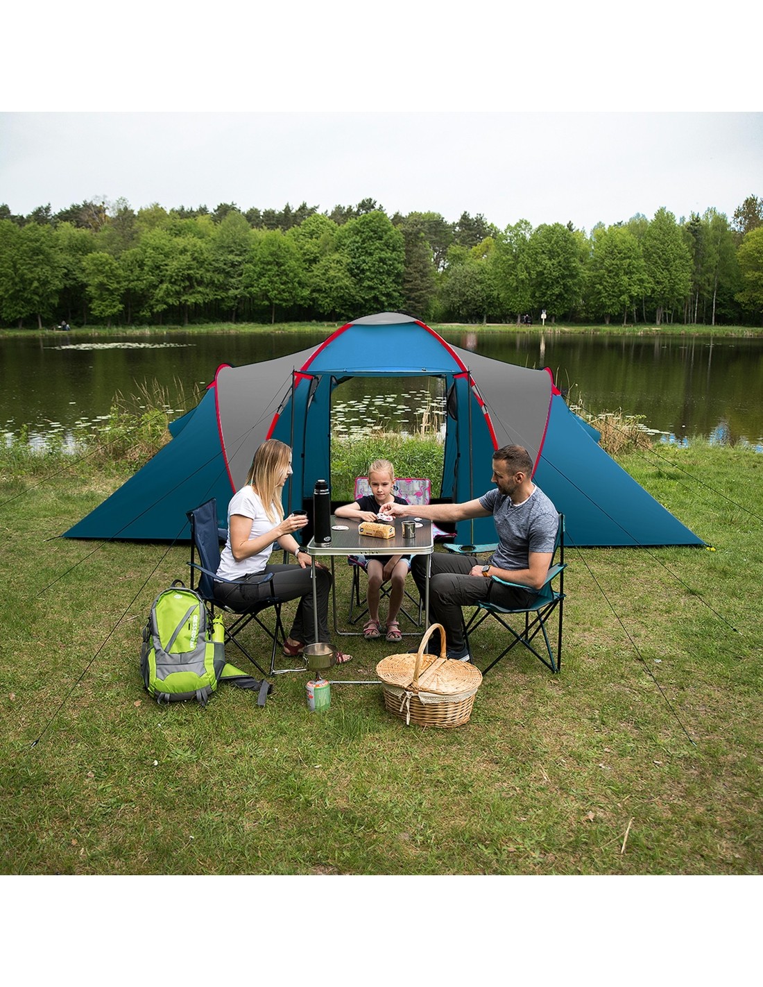 The tent has two main entrances on opposite sides of the vestibule. Using the frames, they can be transformed into practical roofs that increase the usable space and protect against the sun or rain.