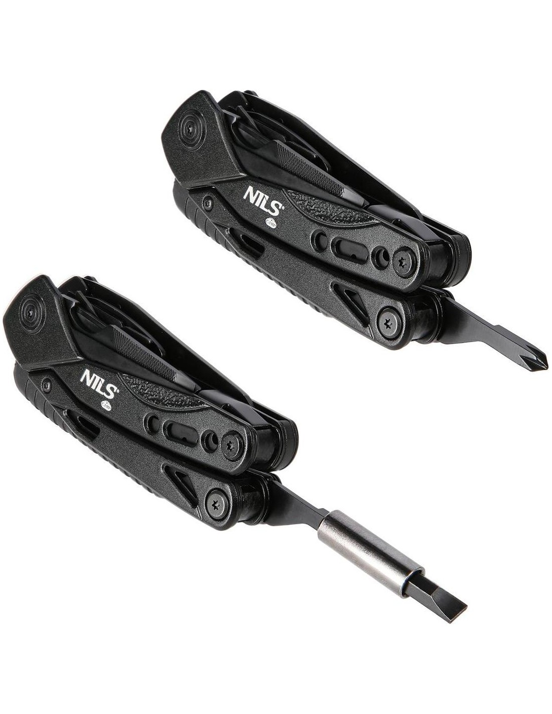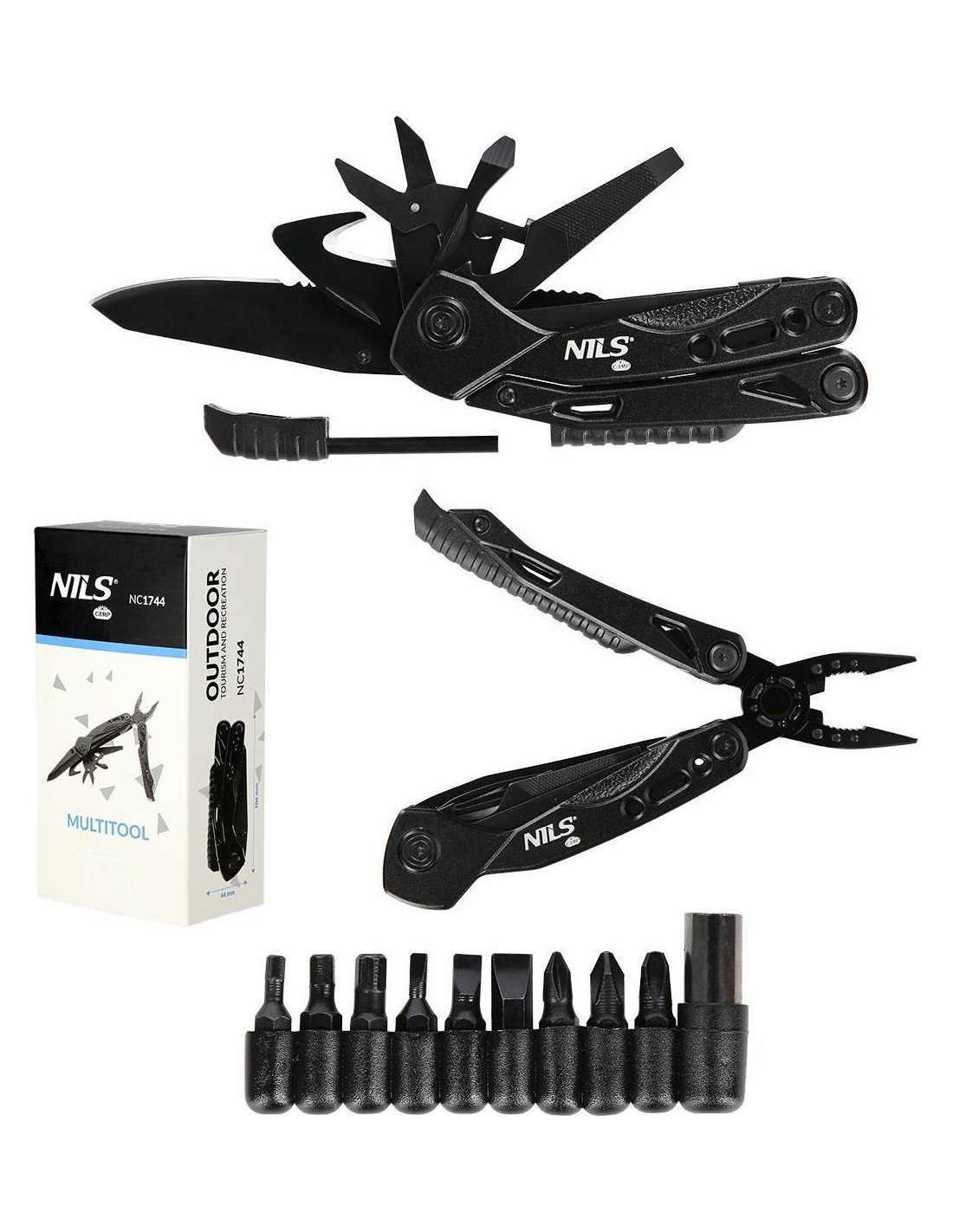 Multitool NC1744 by NILS CAMP is a multifunctional set of tools for DIY enthusiasts, anglers or as additional equipment at home or in the car. NC1744 has 12 necessary tools that will facilitate functioning during tourist trips and everyday activities. The product is made of stainless steel, making it very practical and durable. In addition, the set includes a set of 9 different bits and a lockable case with the option of hanging on the belt. The multitool includes: Pliers Wire cutter Standard pliers Cross screwdriver File A bottle opener Tinder Whistle Scissors Rope cutter Knife 9 different bits Specification: Material: Stainless steel Dimensions: Length: 10.6cm Width: 4.4cm Cover included: yes Weight: 400g Remarks: Not intended for commercial use Guarantee 24 months