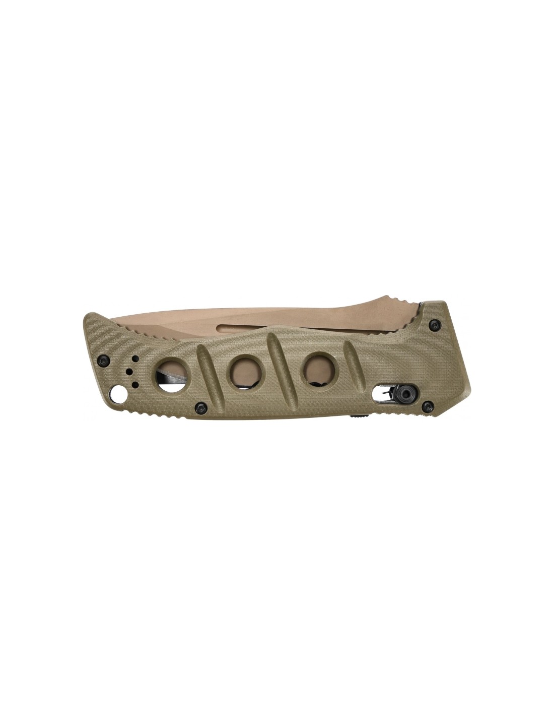 TheBenchmade 2750SFE-2 Auto Adamas is an automatic version of the Adamas tactical knife, designed by respected knifemaker Shane Sibert. The model features a partially serrated head in Flat Dark Earth color and olive drab G10 facings.