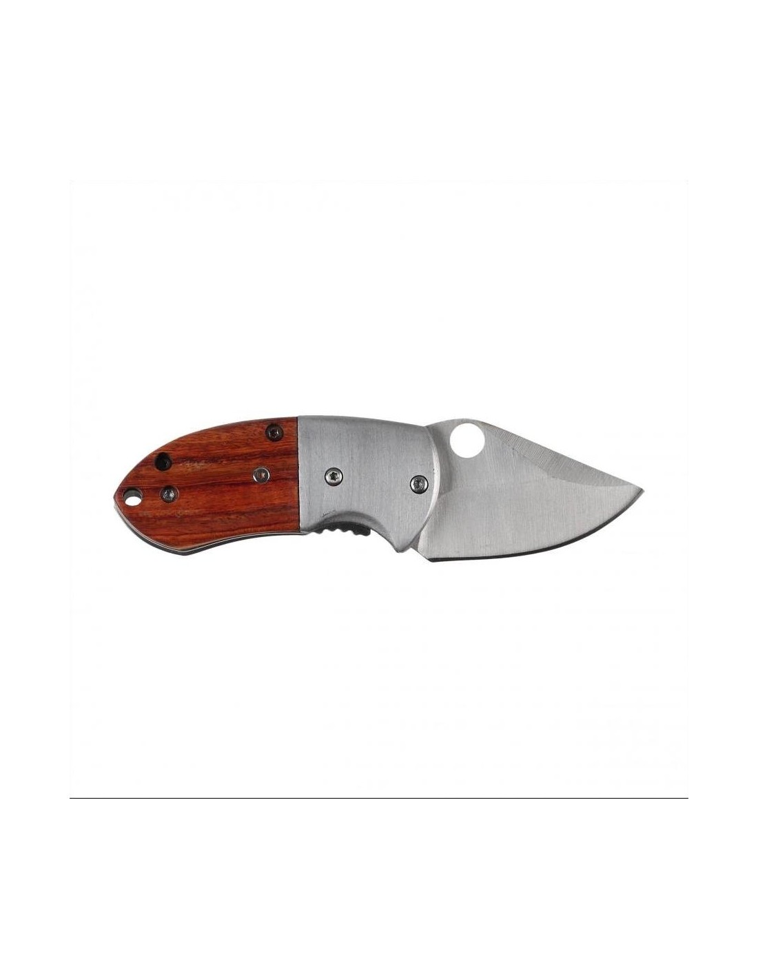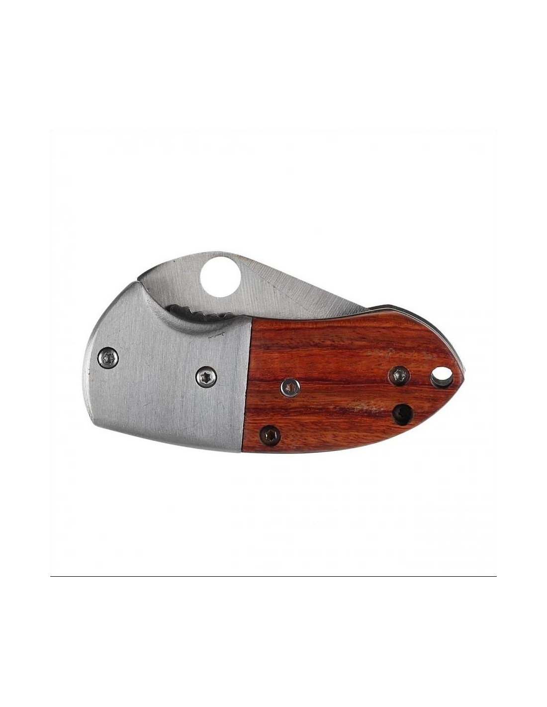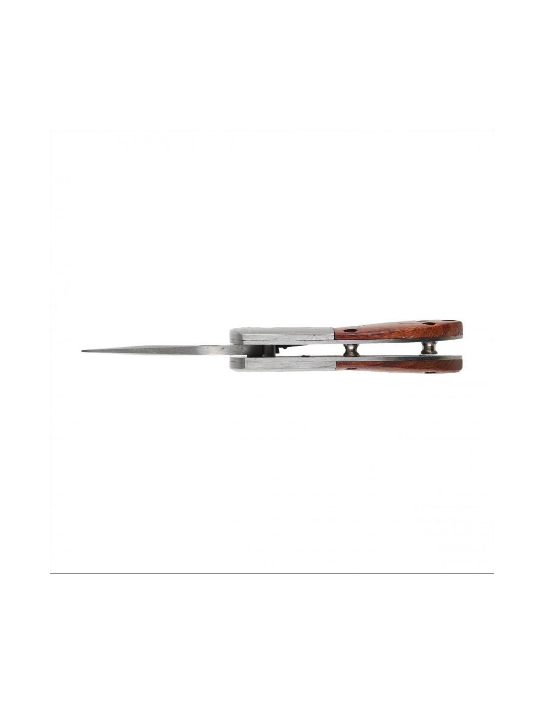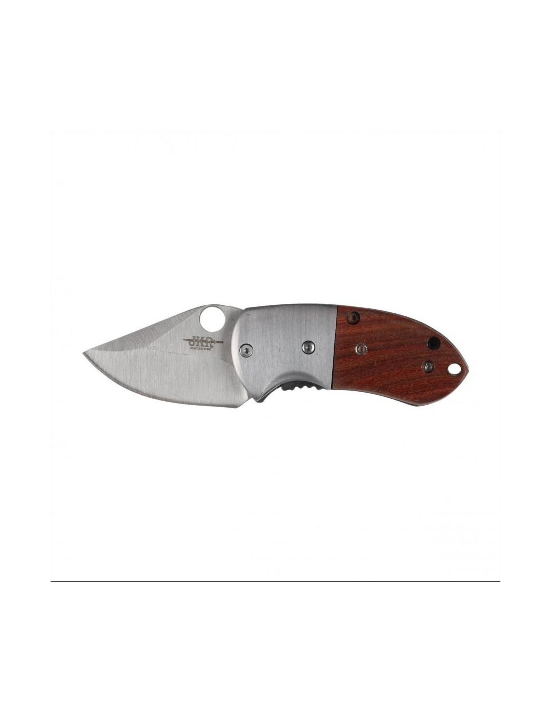 The blade has a derived concave grind and a strong hilt for smooth cutting and high penetration. A hole in the blade allows quick unfolding of the blade with one hand, providing a convenient solution for both right- and left-handed people. When unfolded, the blade is locked by a liner-lock system, a proven mechanism with high mechanical resistance, as well as easy and convenient to use. The locking function is performed by a steel skeleton strip, which wedges the blade from below when opened. In the construction of the knife, a large role is played by the handle, because on it depends the comfort and safety of use. The handle of the knife consists of metal reinforcements (bolsters) and wooden facings attached to the skeleton with screws. A steel, reversible clip and a hole for a rope emphasize the everyday character of the tool.