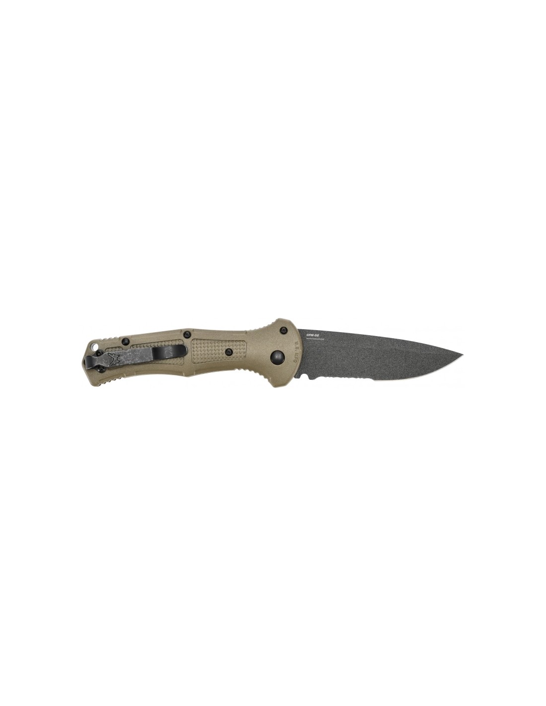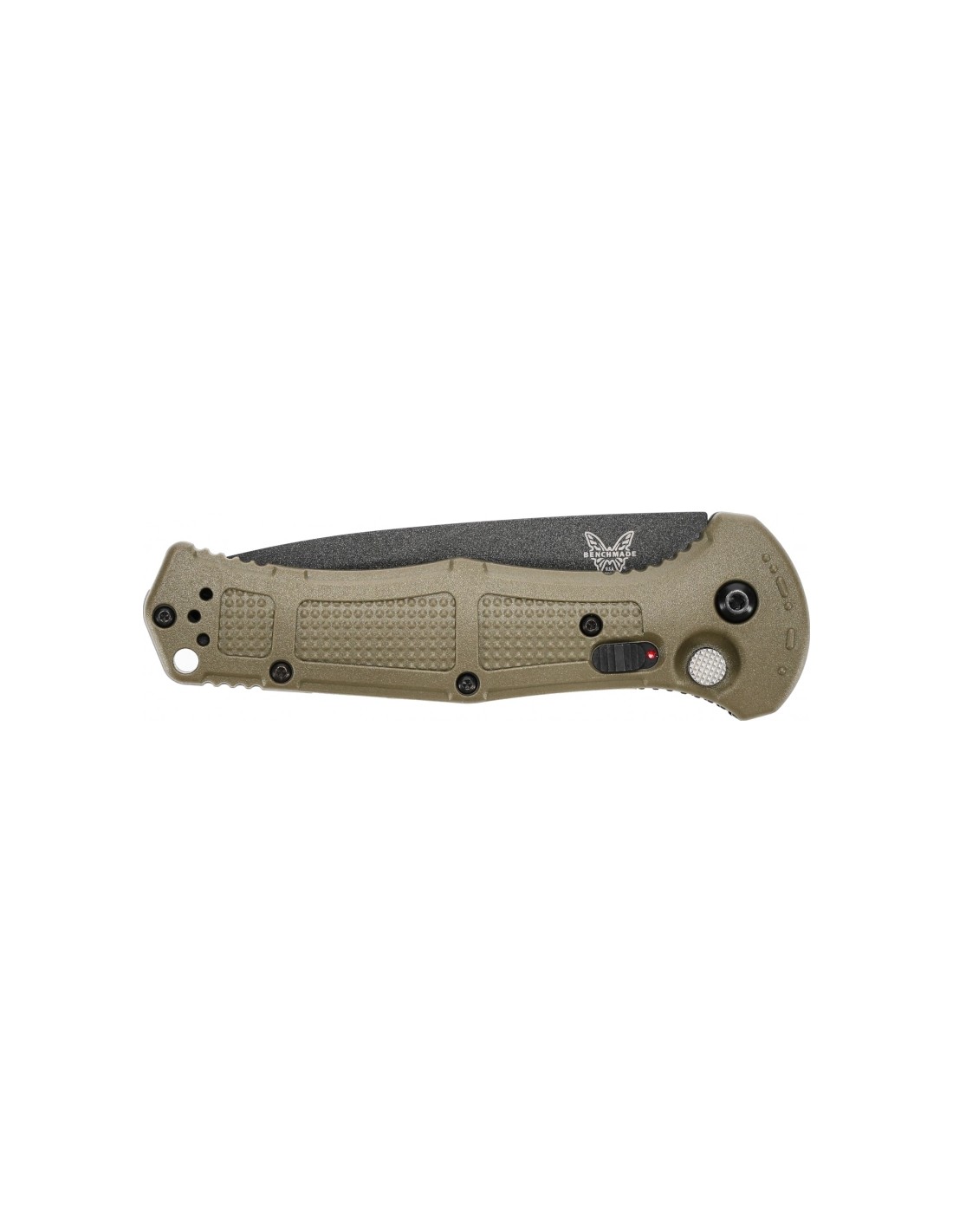 The Benchmade 9070SBK-1 Claymor has molded Grivory plastic liners in ranger green. The glass-epoxy laminate used is characterized by light weight, high mechanical strength, resistance to water, temperature change, as well as many acids and solvents.