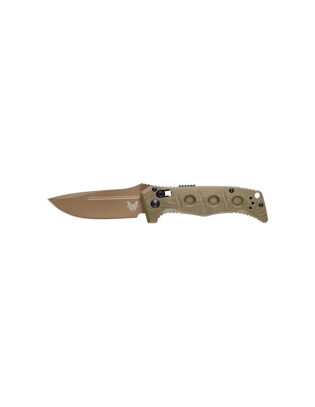 The Benchmade 273FE-2 Mini Adamas has Olive Drab-colored G10 plastic liners made using a precision 3D technique. The glass-epoxy laminate used is characterized by light weight, high mechanical strength, resistance to water, temperature change, as well as many acids and solvents. The contoured shape, combined with the cross-milling and rough texture of the plastic, provide excellent knife grip and comfort. The semi-open handle design makes it easy to keep the knife clean.
