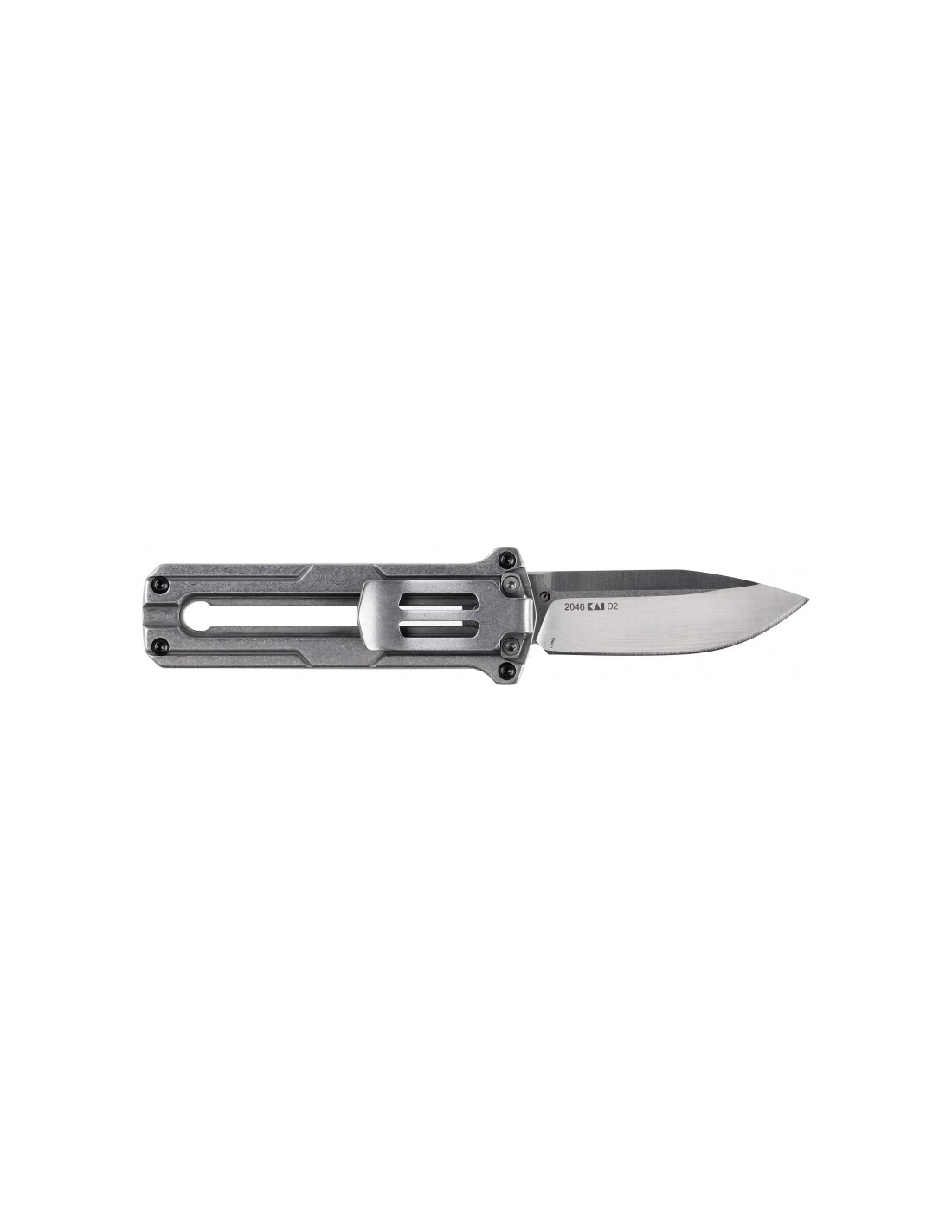 The flat-ground blade is made of D2 tool steel. Thanks to a relatively high admixture of vanadium and a large amount of chromium, the steel has high wear resistance and good resistance to deformation under high temperatures. It cuts quite aggressively. The 61-mm-long blade is extended forward (Out The Front) by means of a slide. The drop-point profile blade has a single-sided cutting edge and a strong hilt, resistant to breakage and chipping. A button-lock guarantees the user the necessary security.