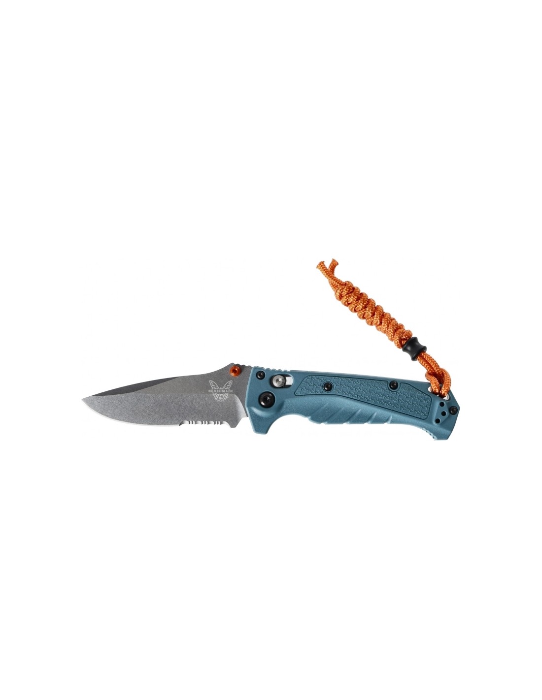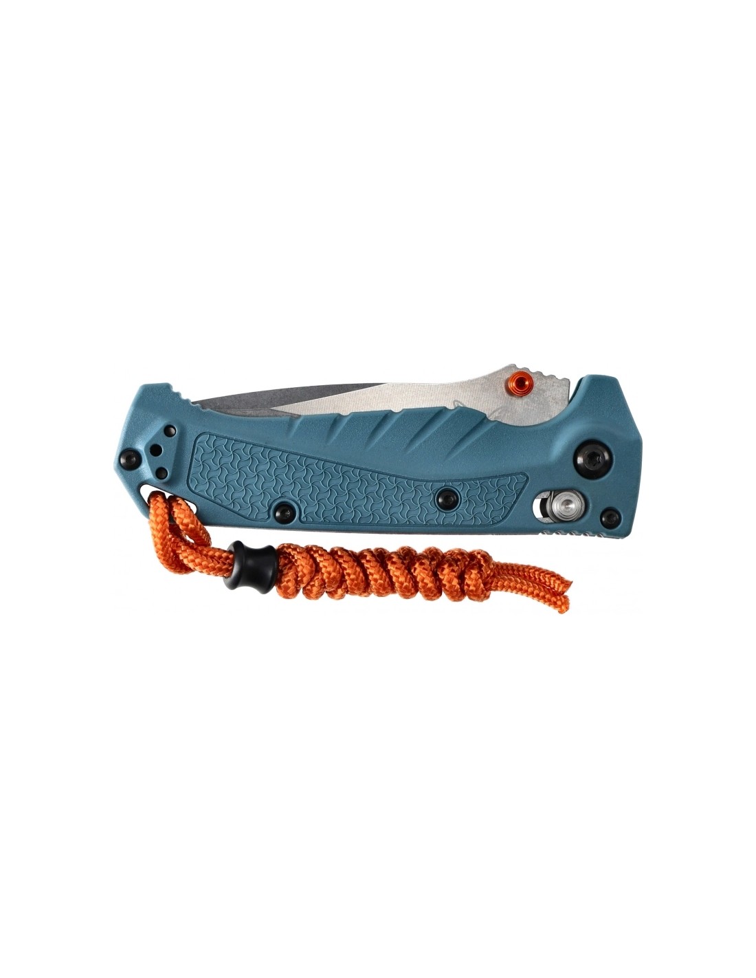 There is also a hole in the handle for attaching a rope or paracord braid. Together with the Benchmade folder, the user receives a paracord sling in orange.