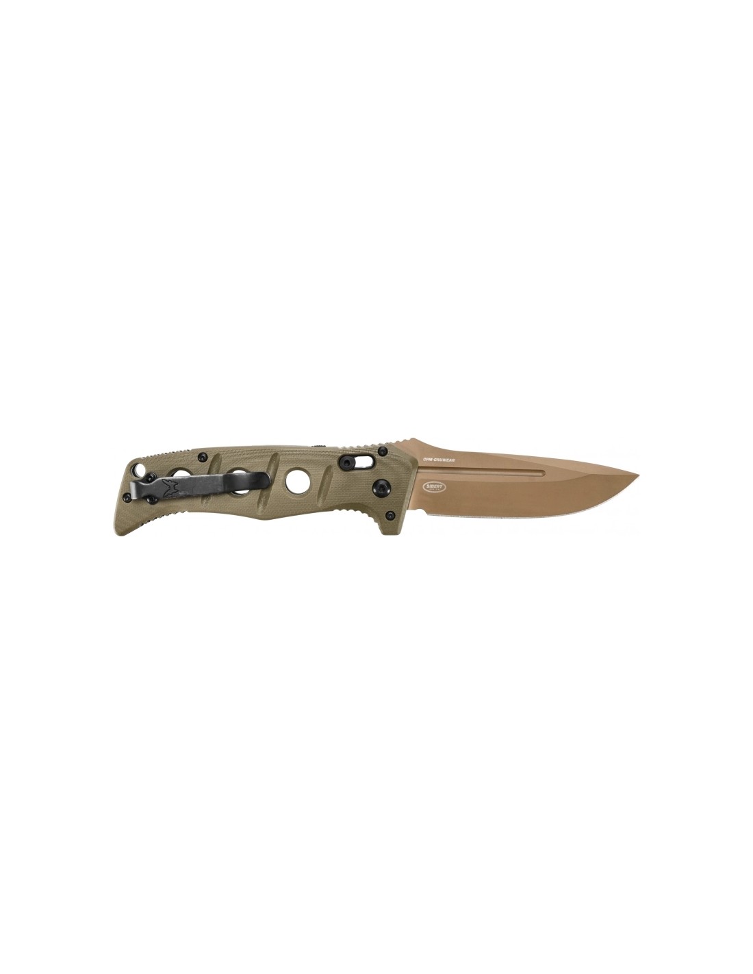 The wide drop-point blade, 96 mm in length, is coated with cerakote in Flat Earth color, which protects against minor scratches and emphasizes the tactical nature of the knife. The blade has a strong stock and a flat grind, which guarantees smooth cutting and easy penetration. The head at its widest point is as much as 3.5 mm thick. The back section of the ridge is raised and transverse cutters are made on it, allowing the finger to rest steadily while working. Such parameters guarantee the functionality and durability of the knife and make it suitable for demanding tasks.