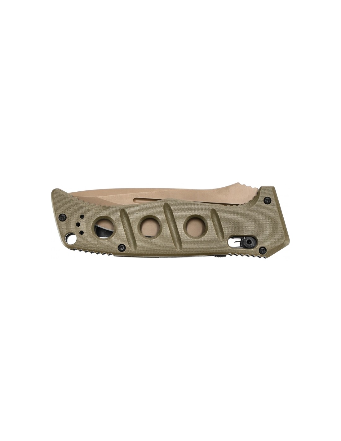 TheBenchmade 2750SFE-2 Adamas has facings of dark green G10 laminate made with precise 3D technique. The glass-epoxy laminate used is characterized by light weight, high mechanical strength, resistance to water, temperature change, as well as many acids and solvents. The contoured shape, combined with the cross-milling and rough texture of the plastic, provide excellent knife grip and comfort. The semi-open handle design makes it easy to keep the knife clean.