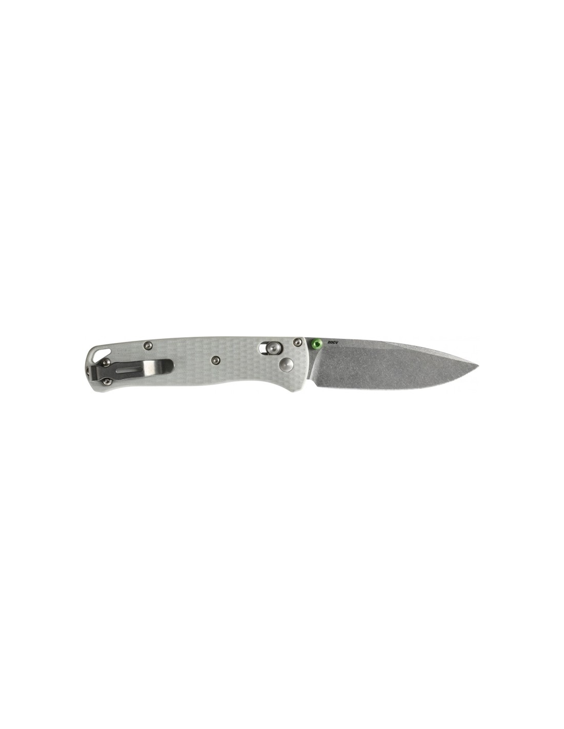 The Benchmade 535-2002 Bugout folding knife is an ultra-lightweight EDC folder in a limited edition of 1,000 pieces, featuring premium CPM-20CV steel, gray G-10 plastic liners, a satin Cerakote blade finish and green-colored accessories.