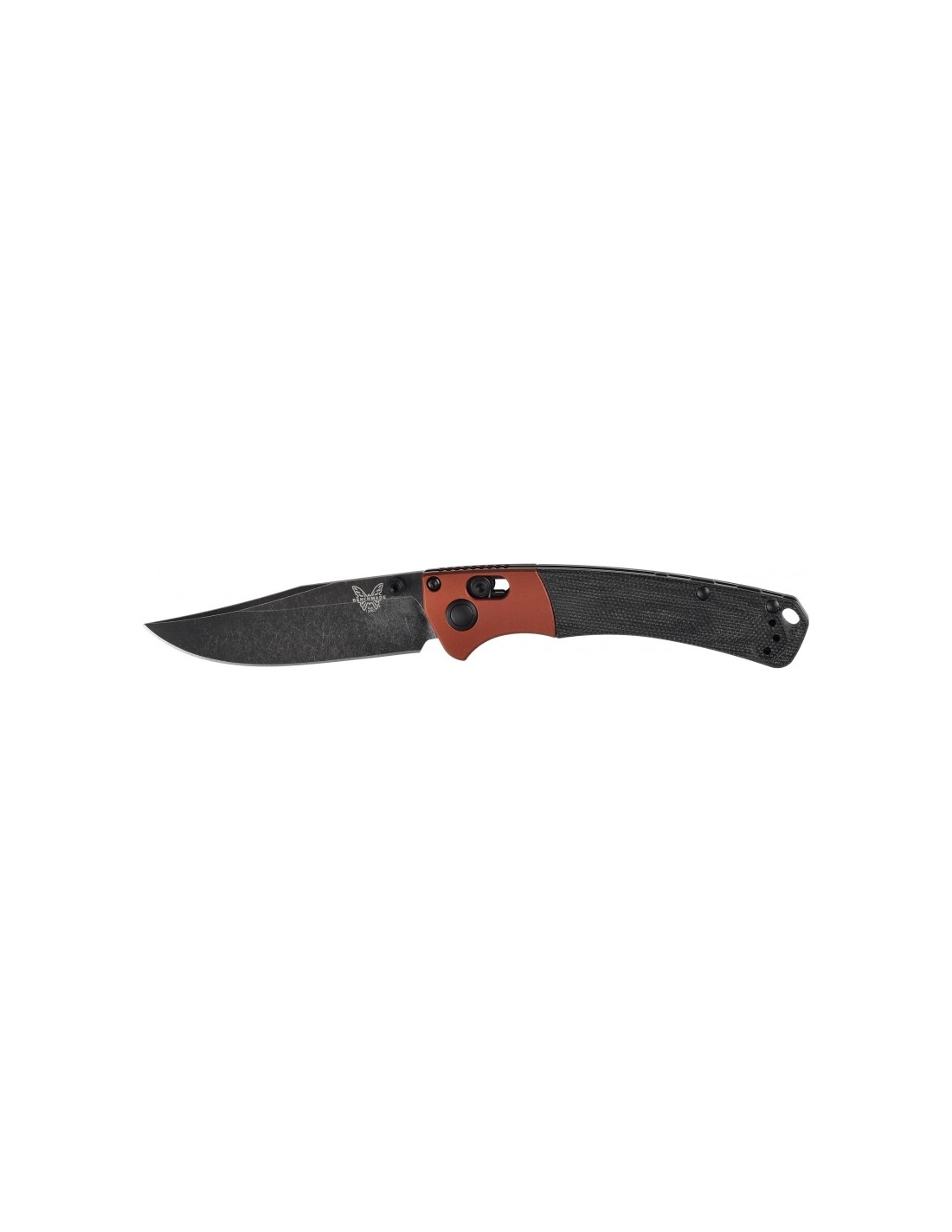 The blade can be conveniently unfolded with one hand, thanks to the use of a double-sided peg , thus allowing both right- and left-handed people to operate the knife comfortably. The blade lock is Benchmade's patented Crossbar Lock, which works by sliding a steel pin across the blade, which, jammed into the corresponding notch, effectively locks the blade in the open and closed positions.
