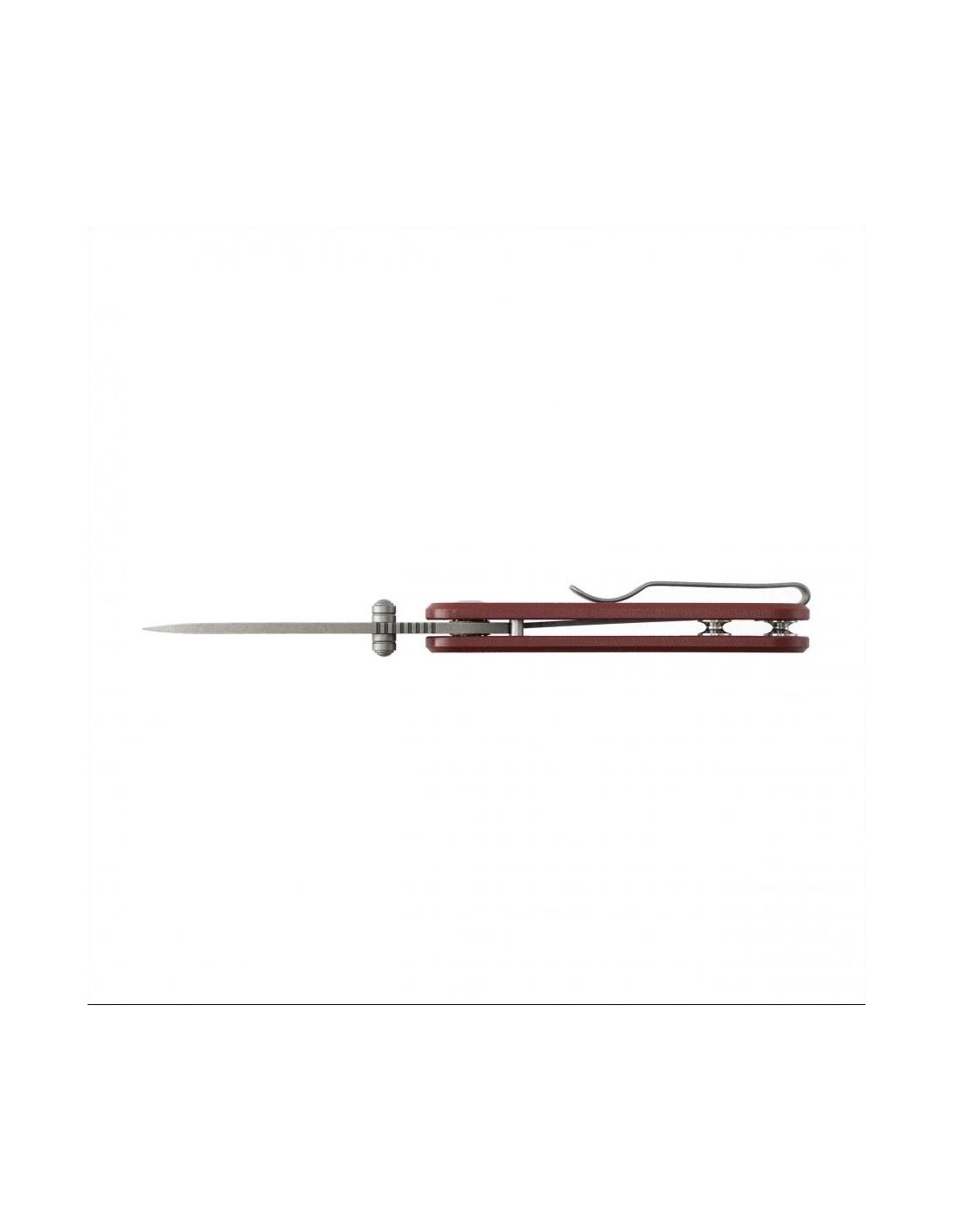 The handle of the Civivi Baby Banter is made of red colored G10 plastic. It is a composite formed from a combination of fiberglass and synthetic resin. It is characterized by light weight and high resistance to mechanical damage. The rough texture of the facings makes the knife lie securely even in a sweaty and overworked hand. The open backed design of the body makes it easy to clean and oil the knife. In the lower part of the handle you can find a hole for a rope or lanyard, in the upper part a small brand logo.