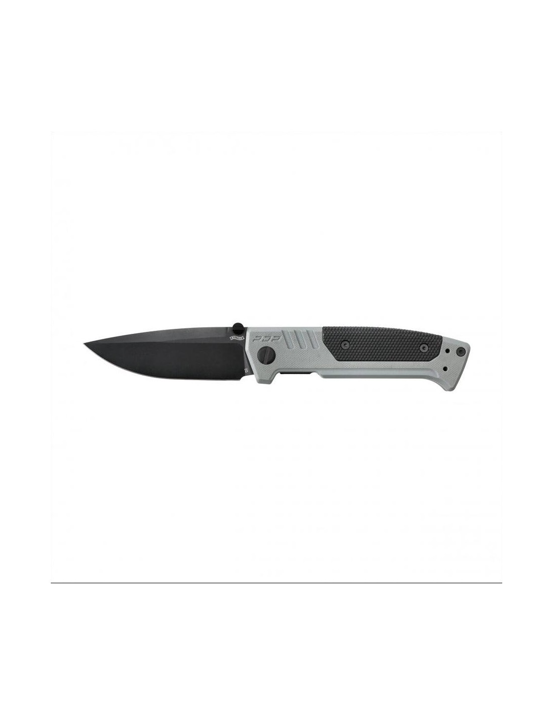 The Walther PDP Spearpoint Folder has a gray-black handle made of G10, a composite of fiberglass and synthetic resin, and with additional FRN plastic overlays. The liners have smooth edges, providing a comfortable grip even during prolonged use.