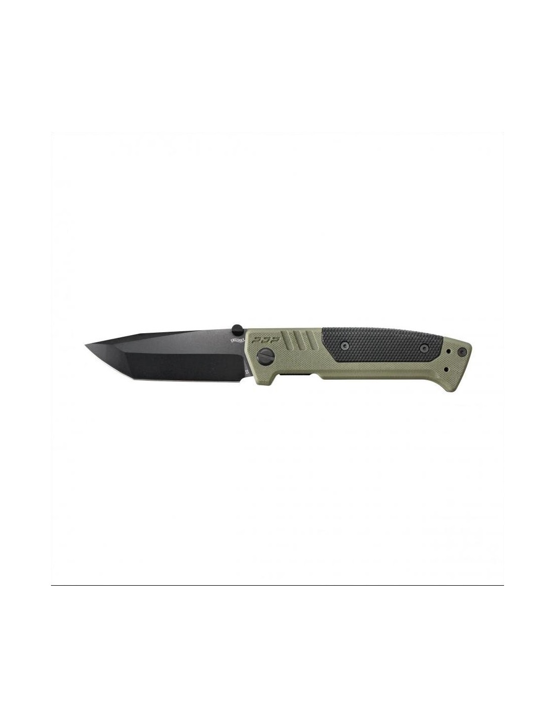 The Walther PDP Spearpoint Folder has a green and black handle made of G10, which is a composite of fiberglass and synthetic resin, and with additional FRN plastic overlays. The liners have smooth edges, providing a comfortable grip even during prolonged use.
