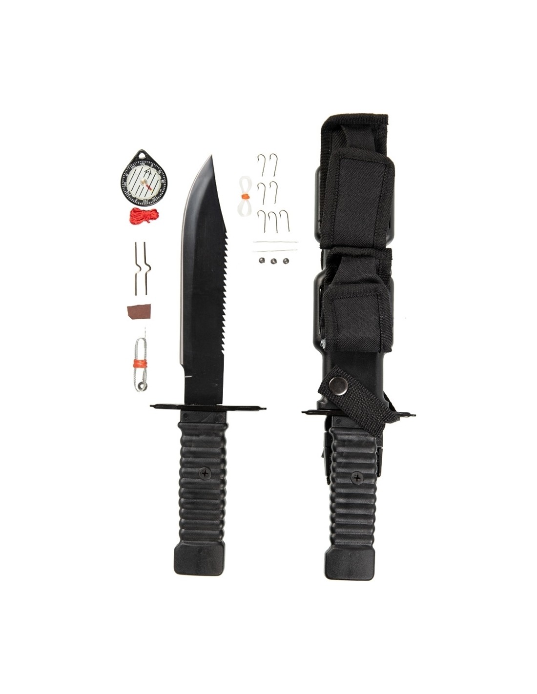 Nóż survivalowy z bogatym wyposażeniem survivalowym: