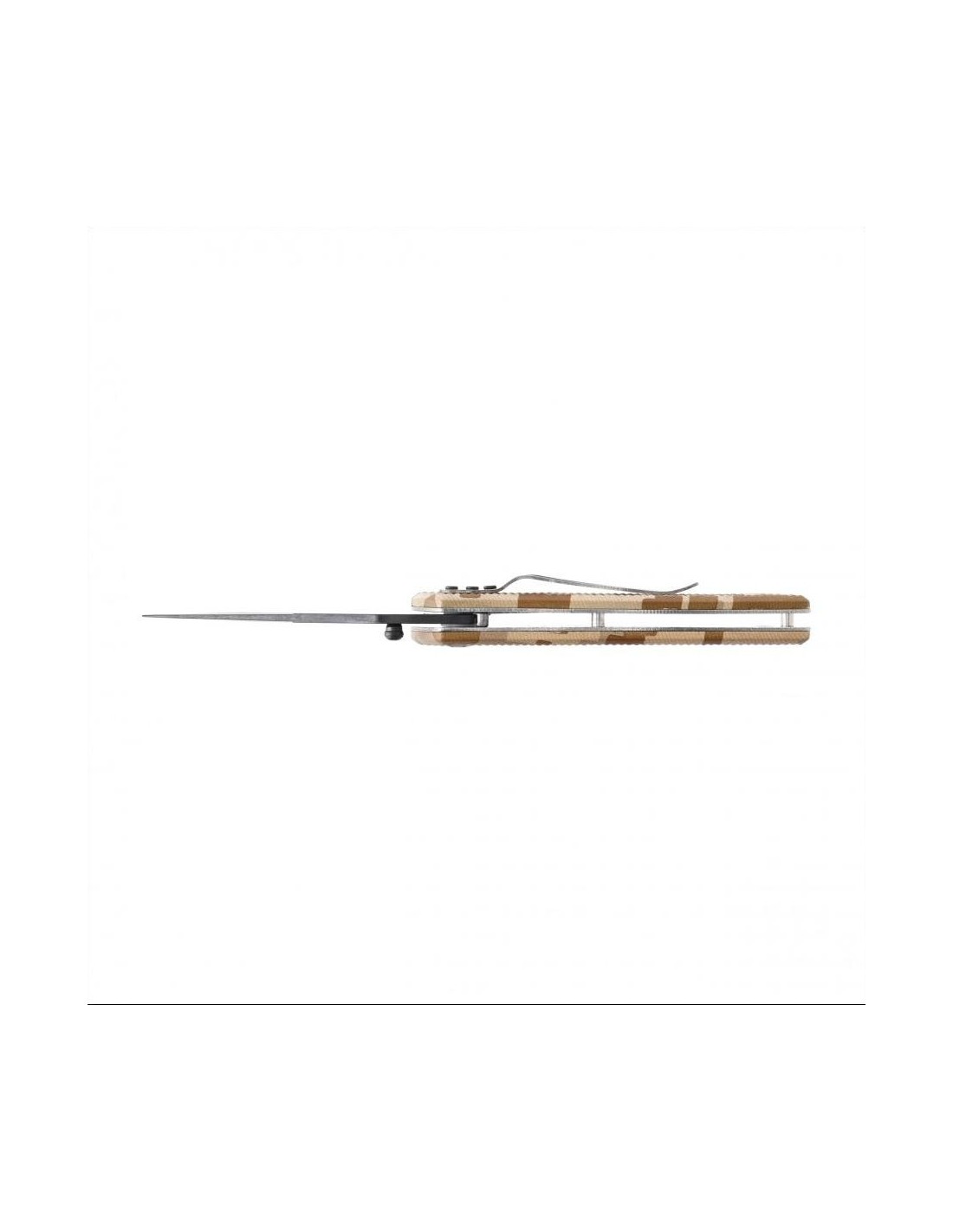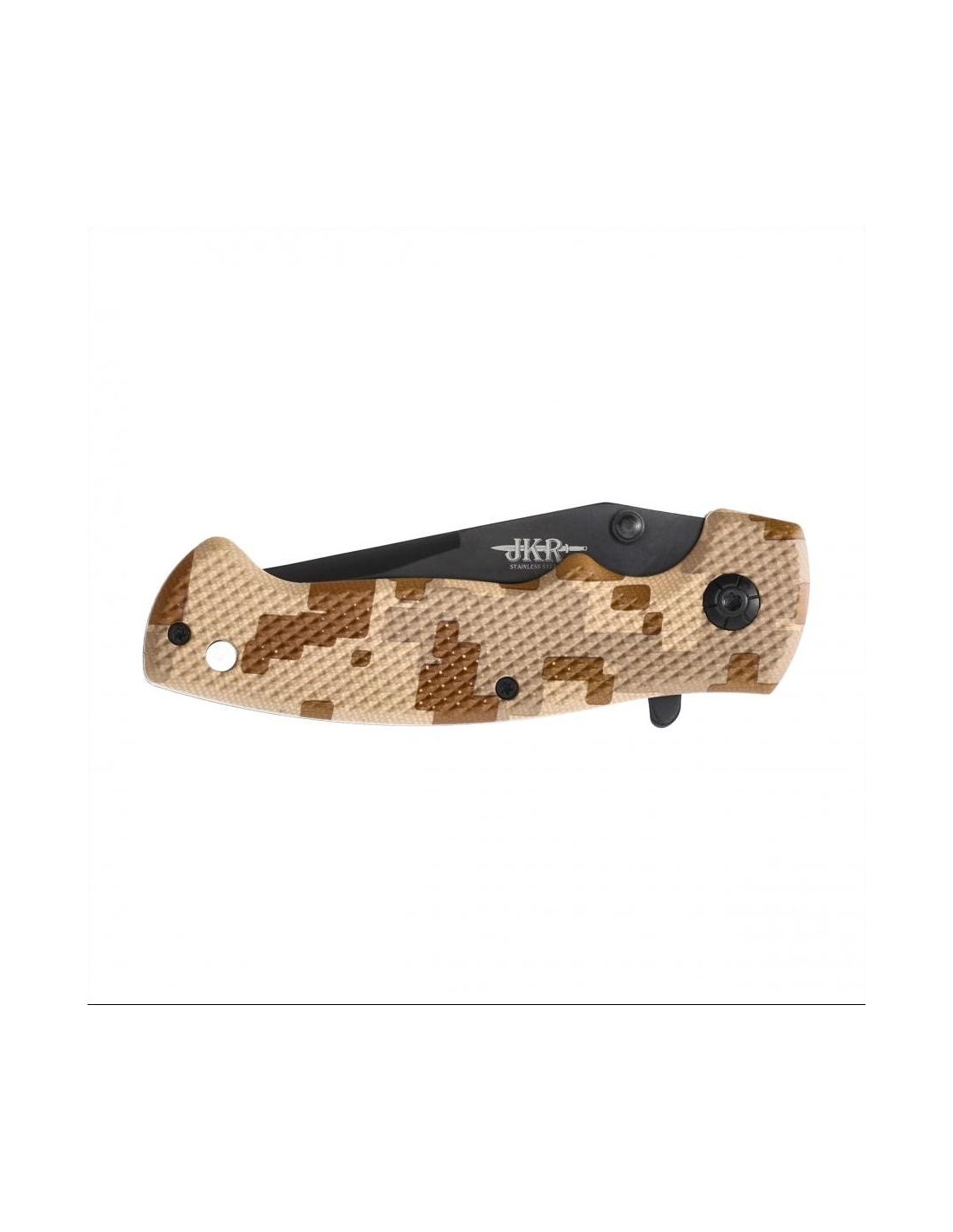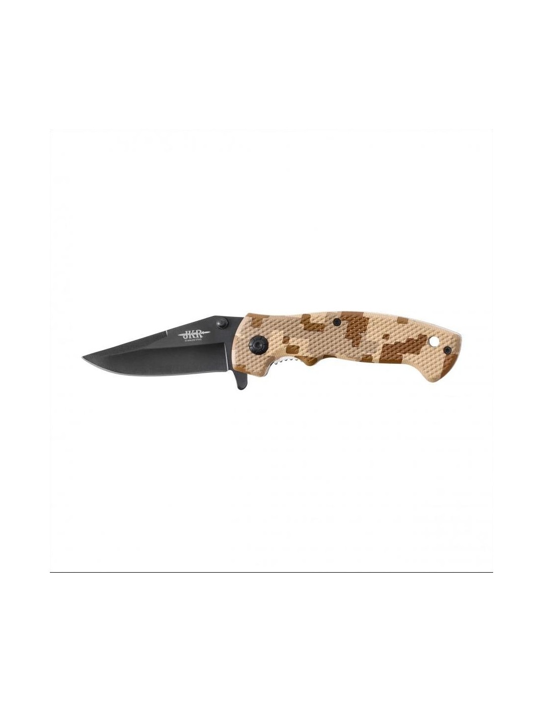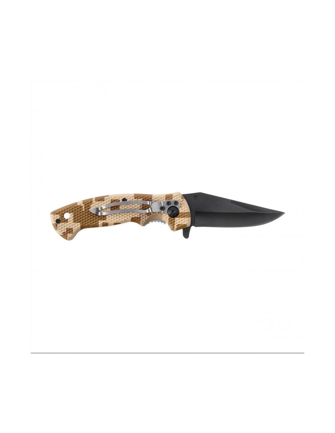 Oferujemy fabrycznie nowy, wysokiej jakości nóż hiszpańskiej marki Joker, znanej na całym świecie z doskonałych produktów. Jest to uniwersalny nóż składany w całości wykonany z mocnej stali nierdzewnej. Rękojeść wykonana jest z wytrzymałego metalu w ciekawym wzorze z gumowymi okładzinami w kolorze pustynnego kamuflażu. Nóż wyposażony jest w flipper, który umożliwia szybkie i łatwe otwarcie noża. Niezawodna i skuteczna blokada noża Liner Lock zapobiega niekontrolowanemu złożeniu noża. Nóż posiada klips, który umożliwia przypięcie go do paska lub schowanie w kieszeni.