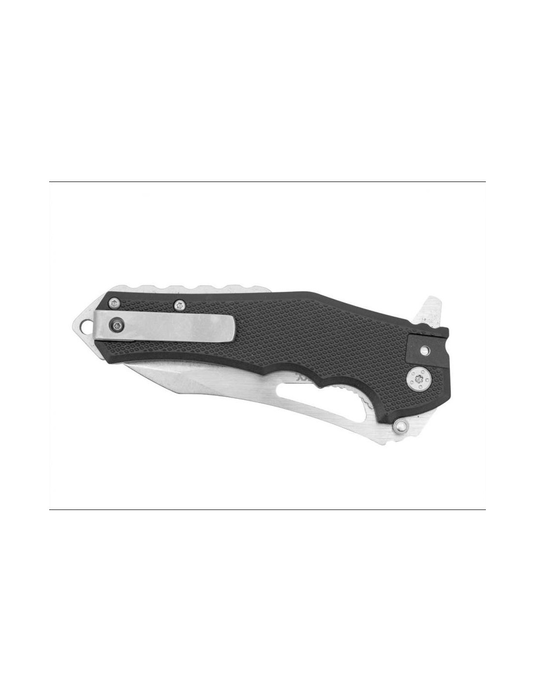Rękojeść noża wykonana została z profilowanych okładzin z wytrzymałego nylonu balistycznego. Wystający z rękojeści stalowy element dystansowy pełni rolę młotka oraz haka na linkę.