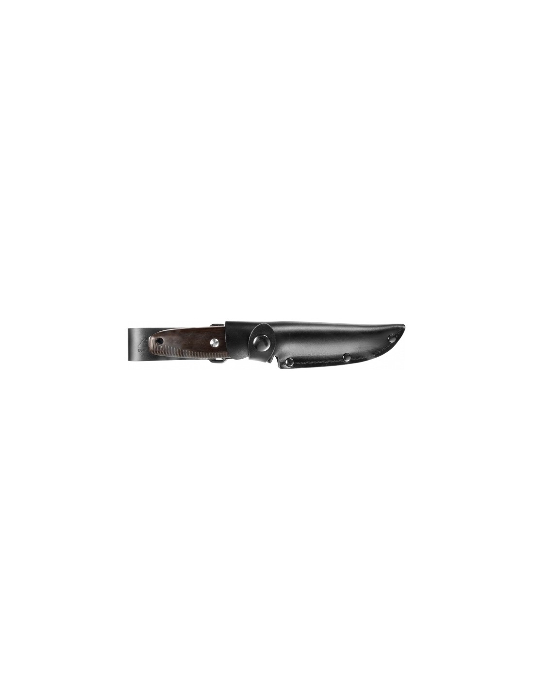 Do przenoszenia noża przy pasku otrzymujemy skórzaną pochewkę zapinaną na metalowy zatrzask. Nóż zapakowany jest w estetyczne, czarne kartonowe pudełko, które doskonale sprawdzi się jako opakowanie prezentowe.