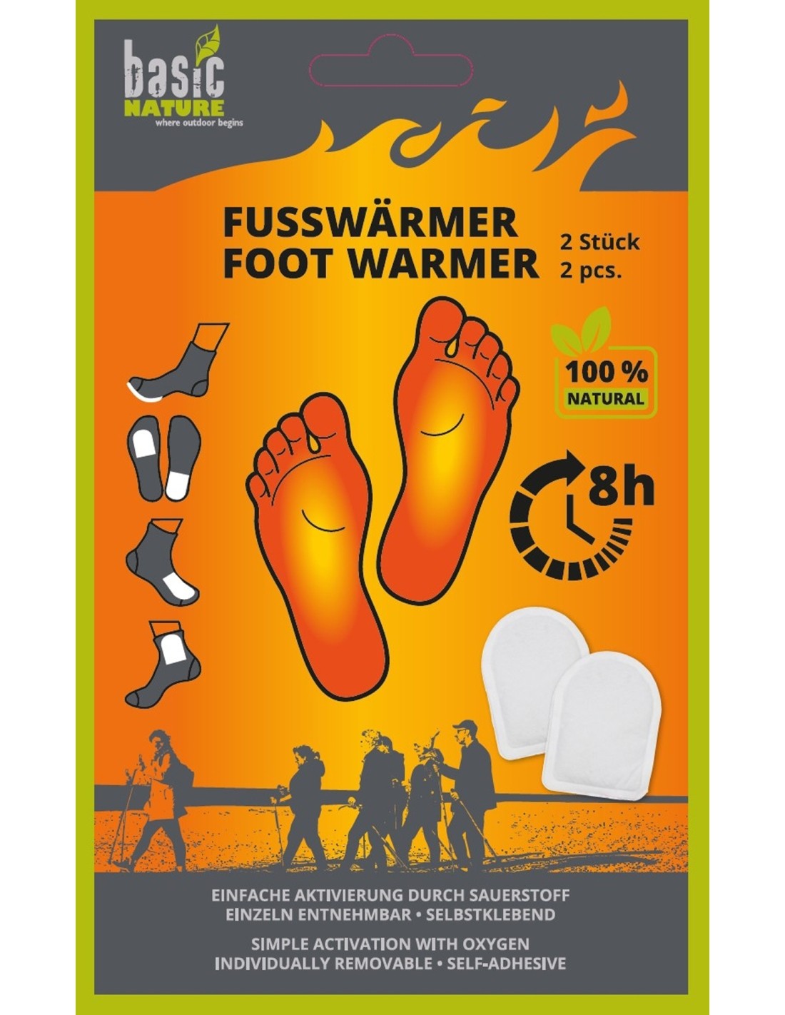 The foot warmer provides reliable and long-lasting warmth. Ideal for travelling or relaxing at home. It is quick and easy to use. Simply open the packaging, activate with oxygen and stick the foot warmer to your socks. Now you can enjoy the pleasant warmth and comfort. The 100% natural ingredients ensure that the product is environmentally friendly. In addition, the foot warmers have a particularly long shelf life when unopened, so you can always fall back on the soothing warmth whenever you need it.+ simple activation with oxygen