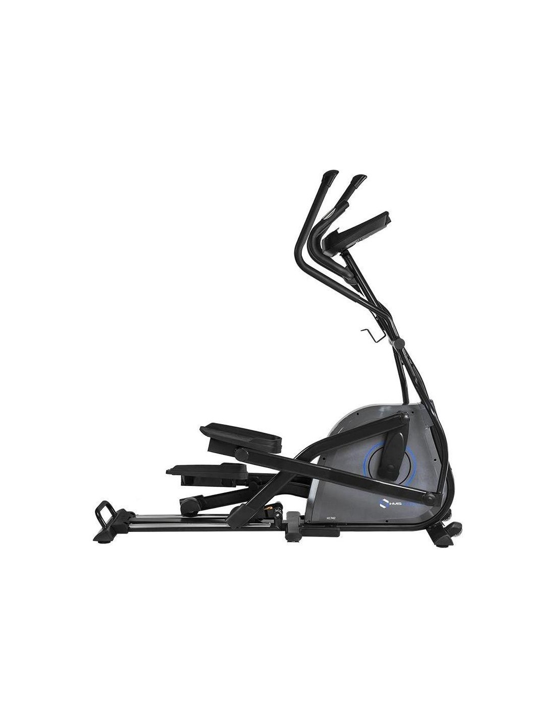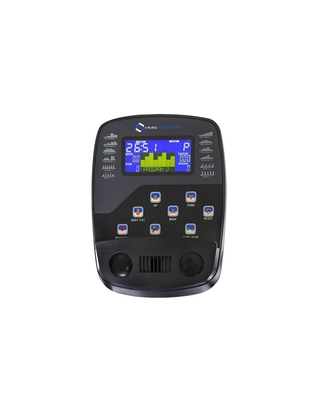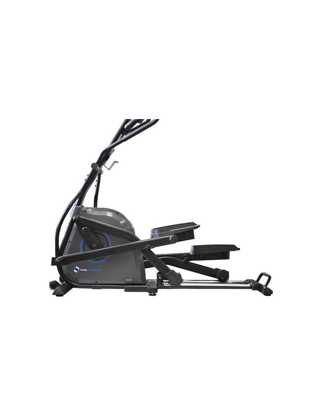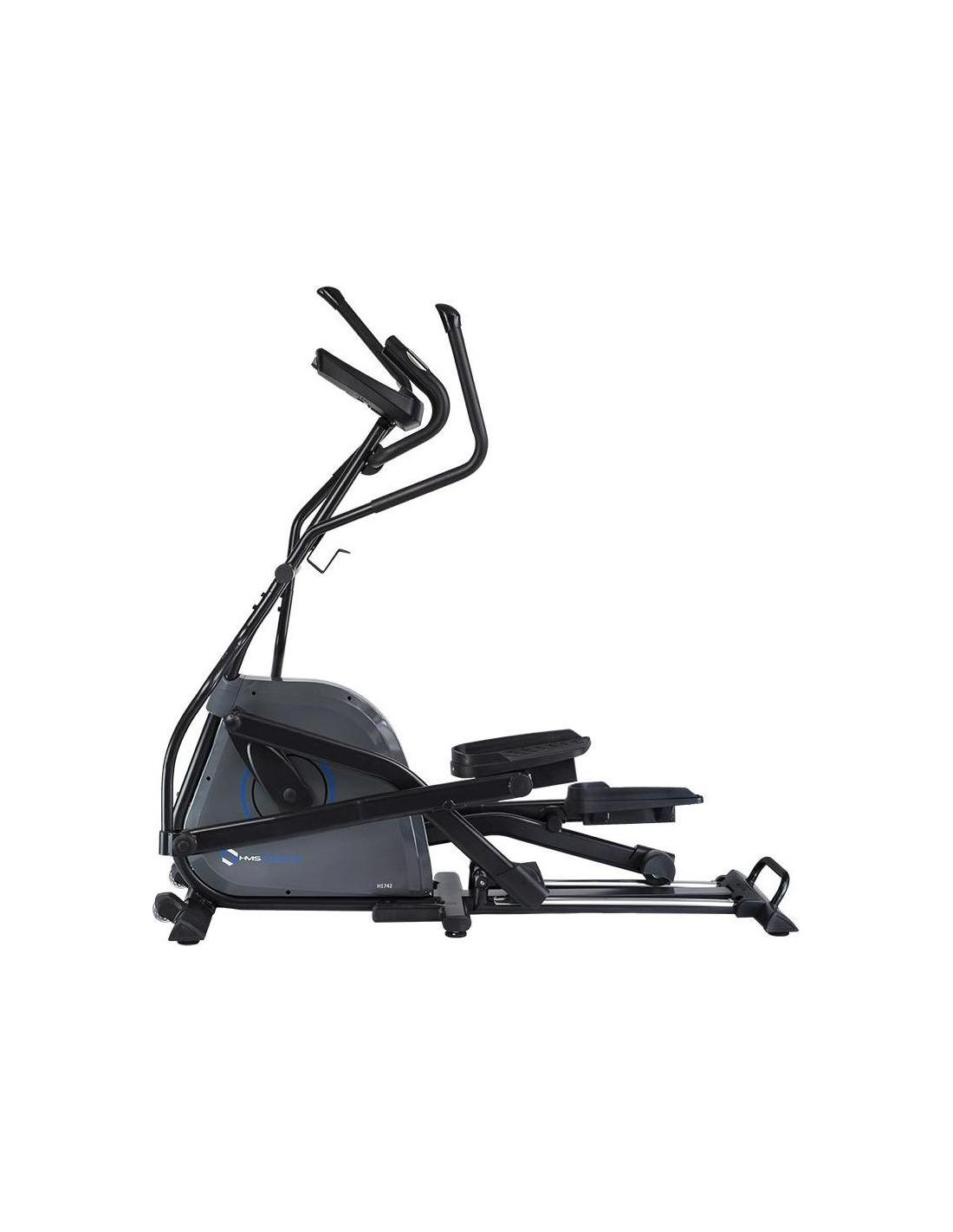 H1742 HMS PREMIUM - magnetyczny trenażer eliptyczny z generatorem. Trenażer eliptyczny firmy HMS PREMIUM wyposażony jest w głośniki i wentylator. Posiada również własny generator prądu, dzięki czemu z maszyny możemy korzystać bez podłączenia do zewnętrznego zasilania - wprawiamy ją w ruch siłą naszych mięśni. Maszyna eliptyczna H1742 HMS PREMIUM wyposażona jest w wewnętrzny magnetyczny system hamowania. W praktyce oznacza to, że za zatrzymanie koła odpowiedzialne są magnesy. Wbudowany komputer pozwala nam kontrolować obciążenie - silnik przesuwa ramię z magnesami bliżej lub dalej od koła zamachowego, aby zmniejszyć lub zwiększyć obciążenie maszyny. Użytkownik może również polegać na dużym komputerze, pomagającym mu w ustawieniu wszystkich parametrów podczas treningu, takich jak czas treningu, cel czy obciążenie. Maszyna oferuje 12 wbudowanych programów treningowych oraz tryb manualny. Kolejną funkcją trenażera eliptycznego H1742 PREMIUM jest pomiar tkanki tłuszczowej - Body Fat, oraz weryfikacja wydolności organizmu - Recovery. Komputer w H1742 PREMNIUM oferuje możliwość regulacji wysokości i położenia, co przekłada się na komfort użytkowania. Dodatkowo, możliwa jest również regulacja nachylenia stopni. Aż 5 poziomów sprawia, że użytkownik może dostosować stopień trudności do swojego treningu. Trenażer eliptyczny wyposażony jest również w sensory dotykowe, gniazdo mini Jack, port USB oraz uchwyt na butelkę z wodą. Maszyna eliptyczna H1742 PREMIUM jest urządzeniem klasy Semi Commercial.