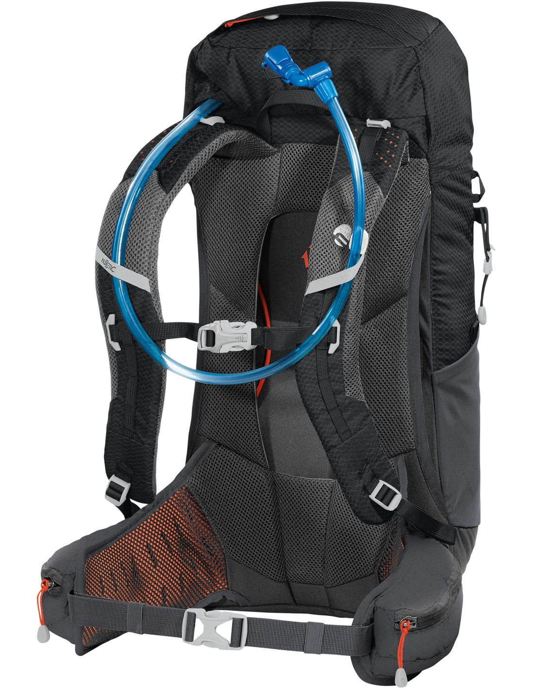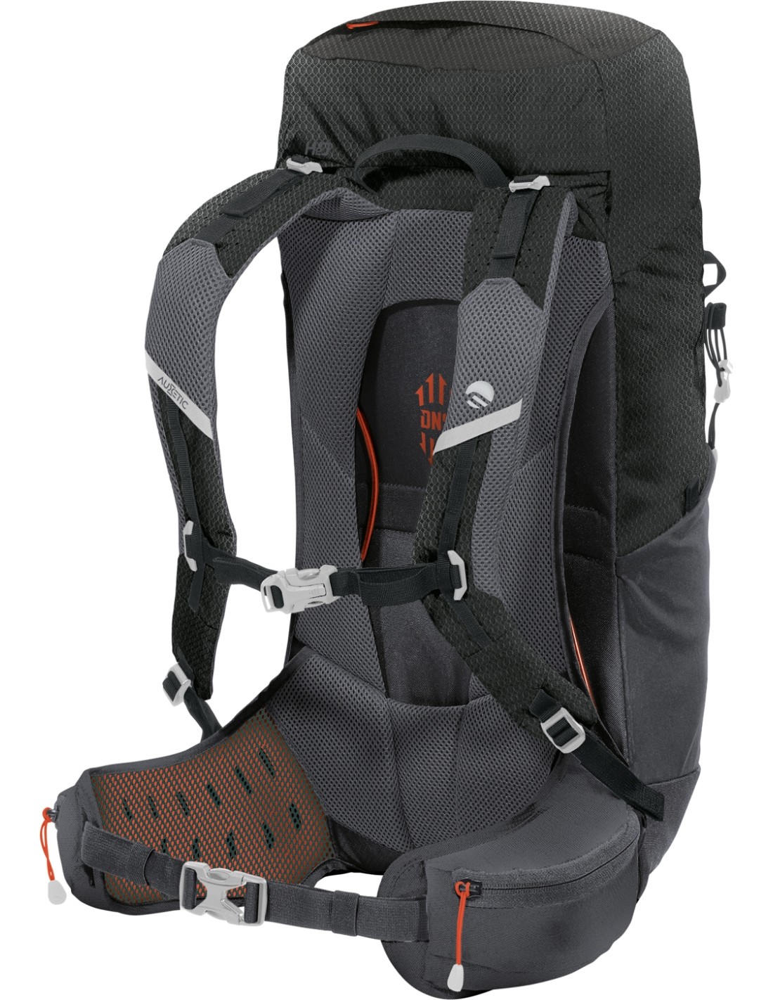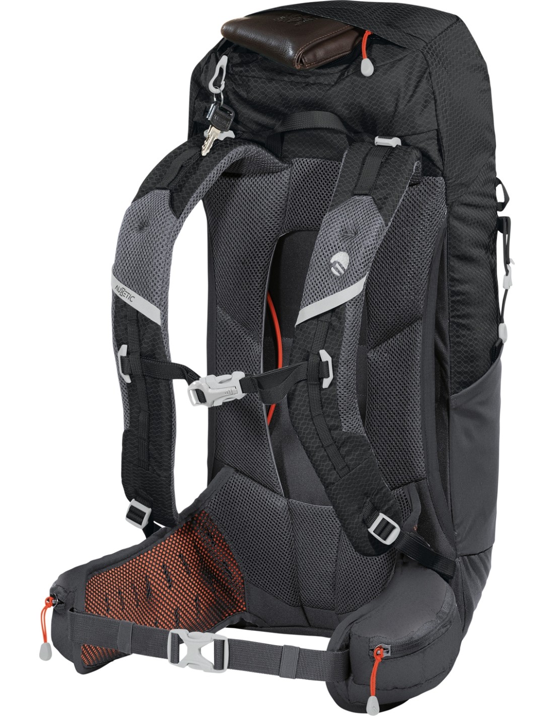 Specially developed lightweight backpack with the latest Auxetic technology on the shoulder straps. With this technology you reduce heat at the points of contact with the body as a result. The Dry Net system with a support frame made of flexible steel ensures perfect load distribution. The shoulder straps with Auxetic padding to improve ventilation. Equipped with several compartments, mesh side pockets, pole/ice ax holder, side compression straps, front gear loop and backpack cover.+ with rain protection