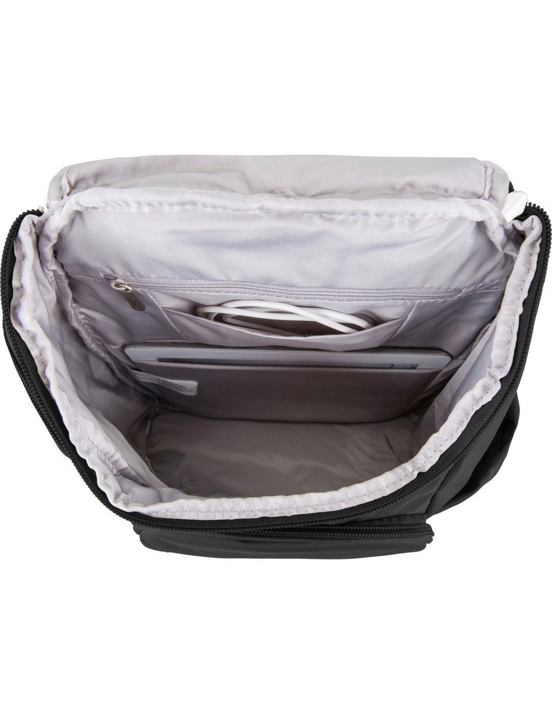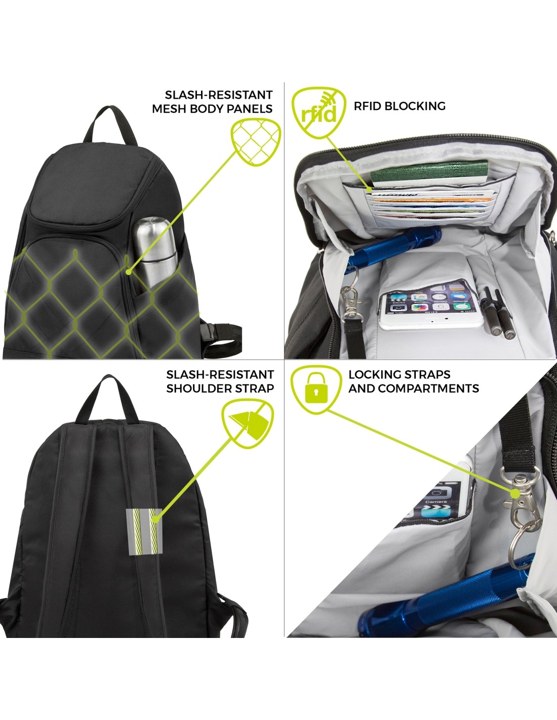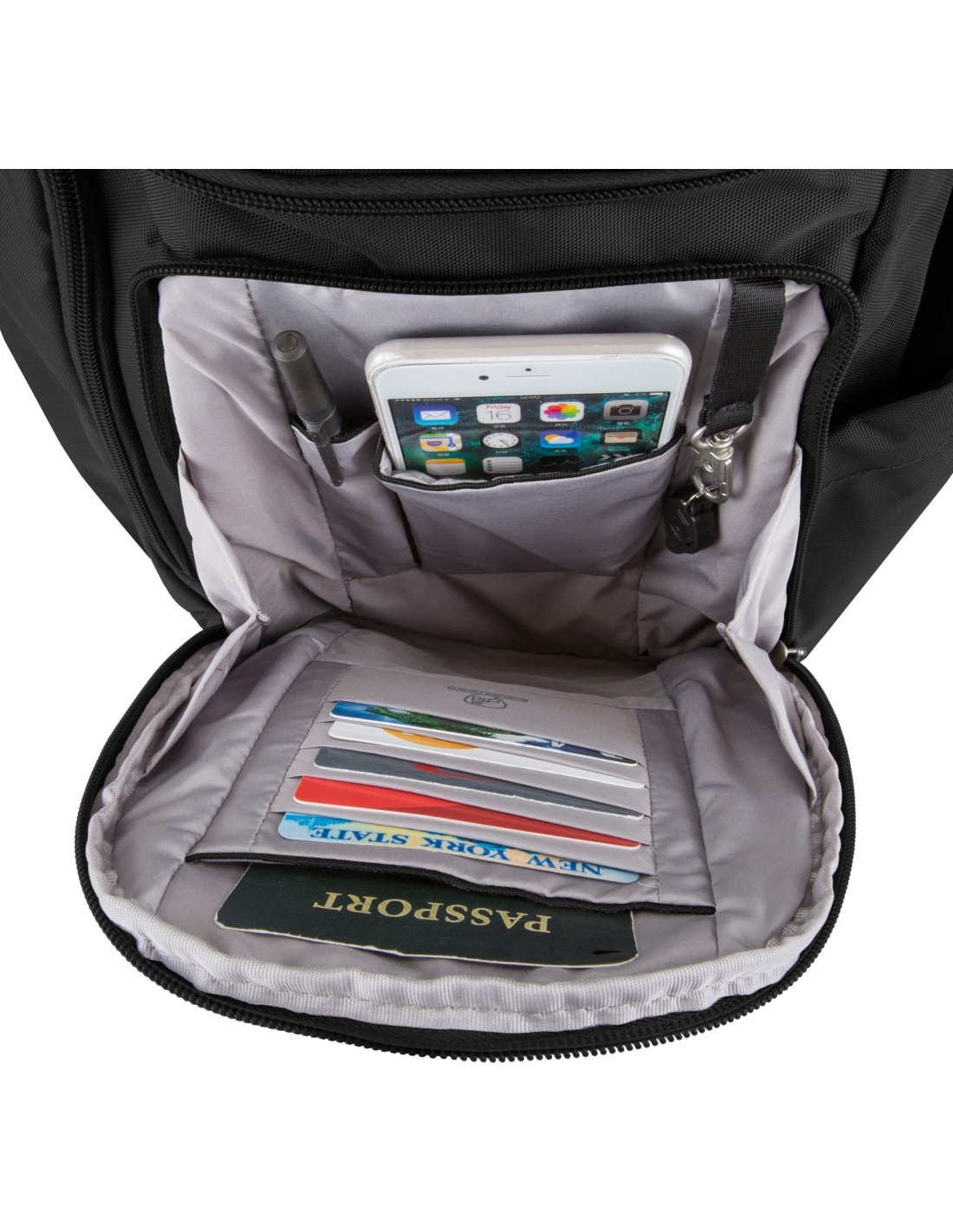 The anti-theft backpack made of stainless steel mesh. Is equipped with a cut-resistant strap and anti-theft zippers to protect your personal belongings. The belt hides stainless steel ropes to prevent cutting. The backpack has a key clip with LED lamp, handle and a side pocket for a water bottle. The rear compartment is equipped with fleece, e.g. for the transport of a 15.6 "laptop or tablet. The front compartment has RFID protection for passport and credit cards.+ lockable zippers