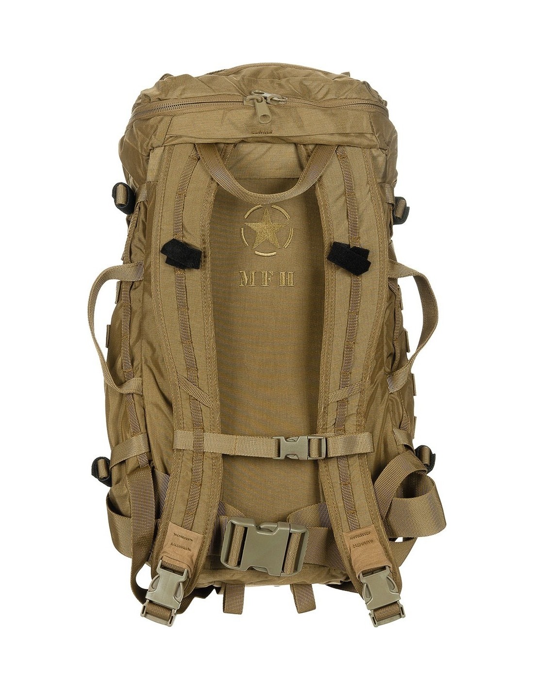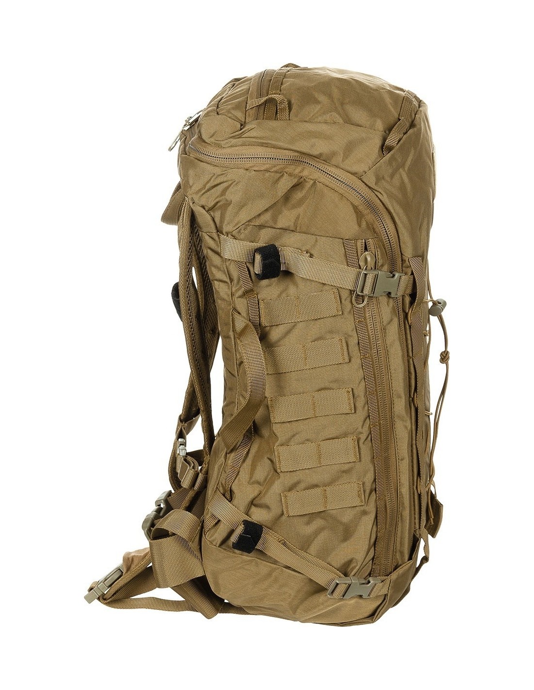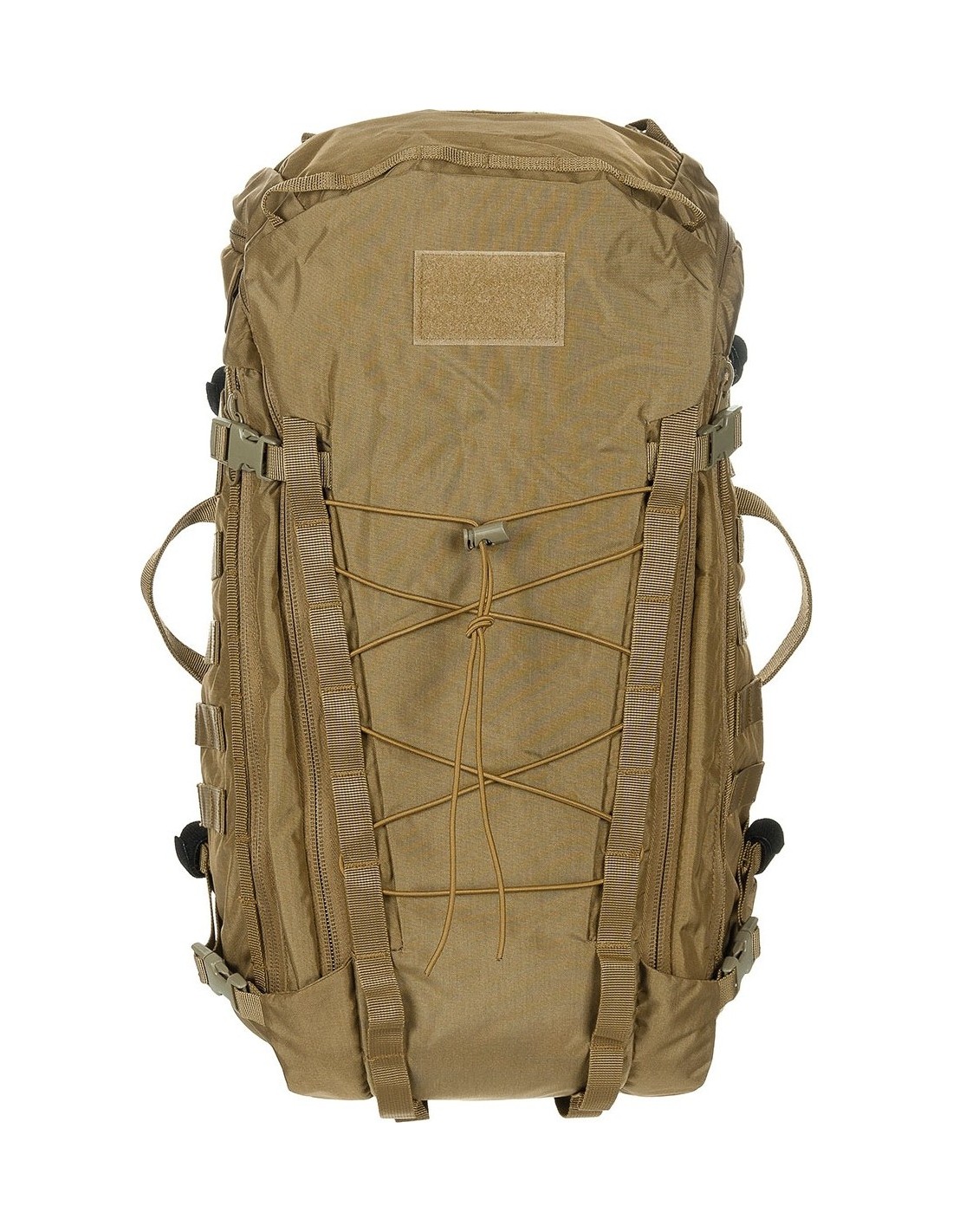 - Przód z elastycznym sznurkiem ściągającym ze stoperem i biegnącymi po bokach pętlami do mocowania Molle .