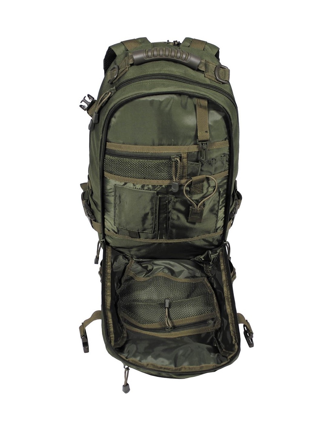 - Przód z małą kieszenią na suwak, różnymi bocznymi pętlami i panelem velcro ok. 10 x 5 cm .