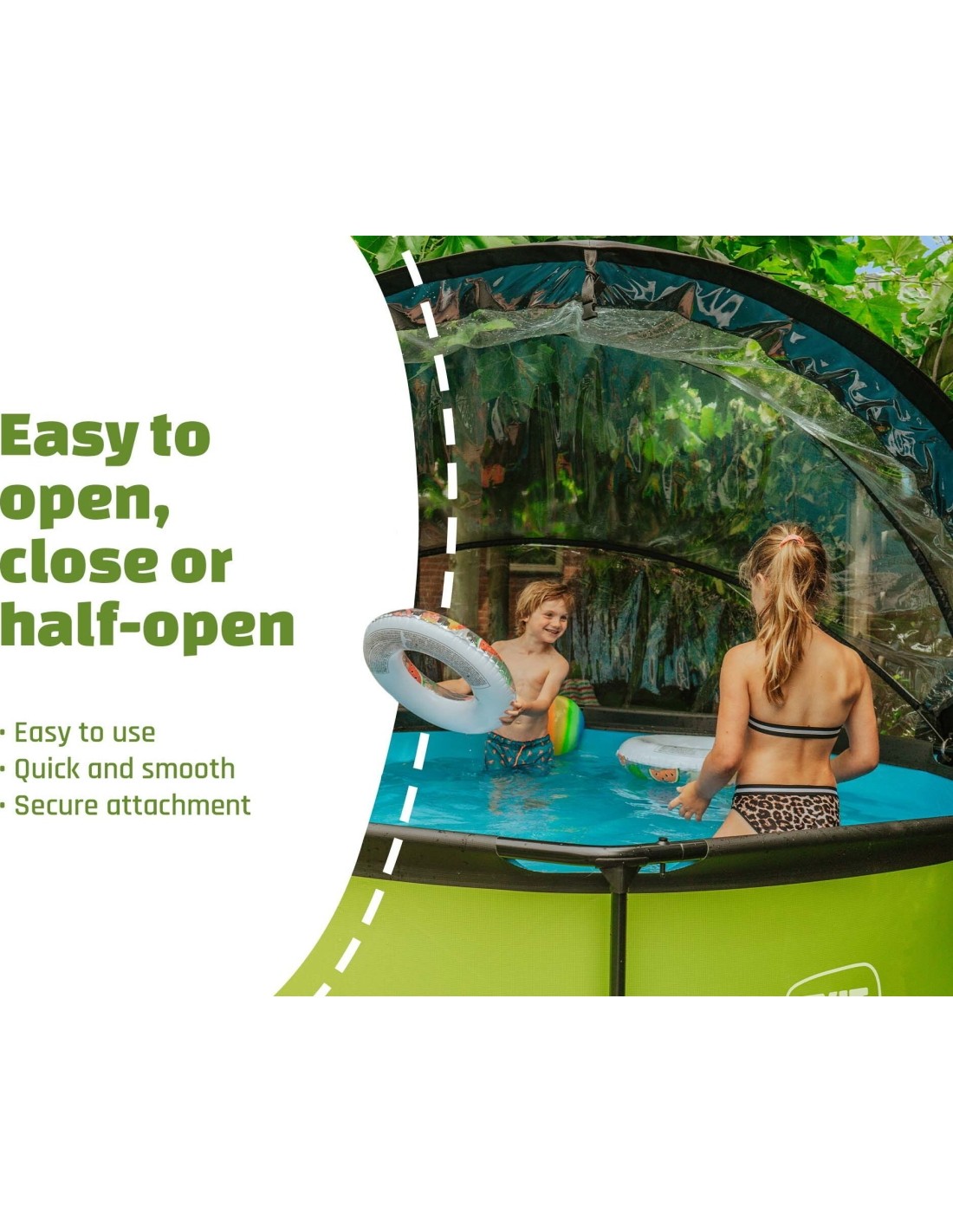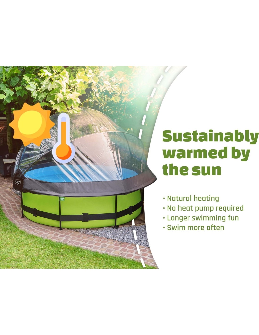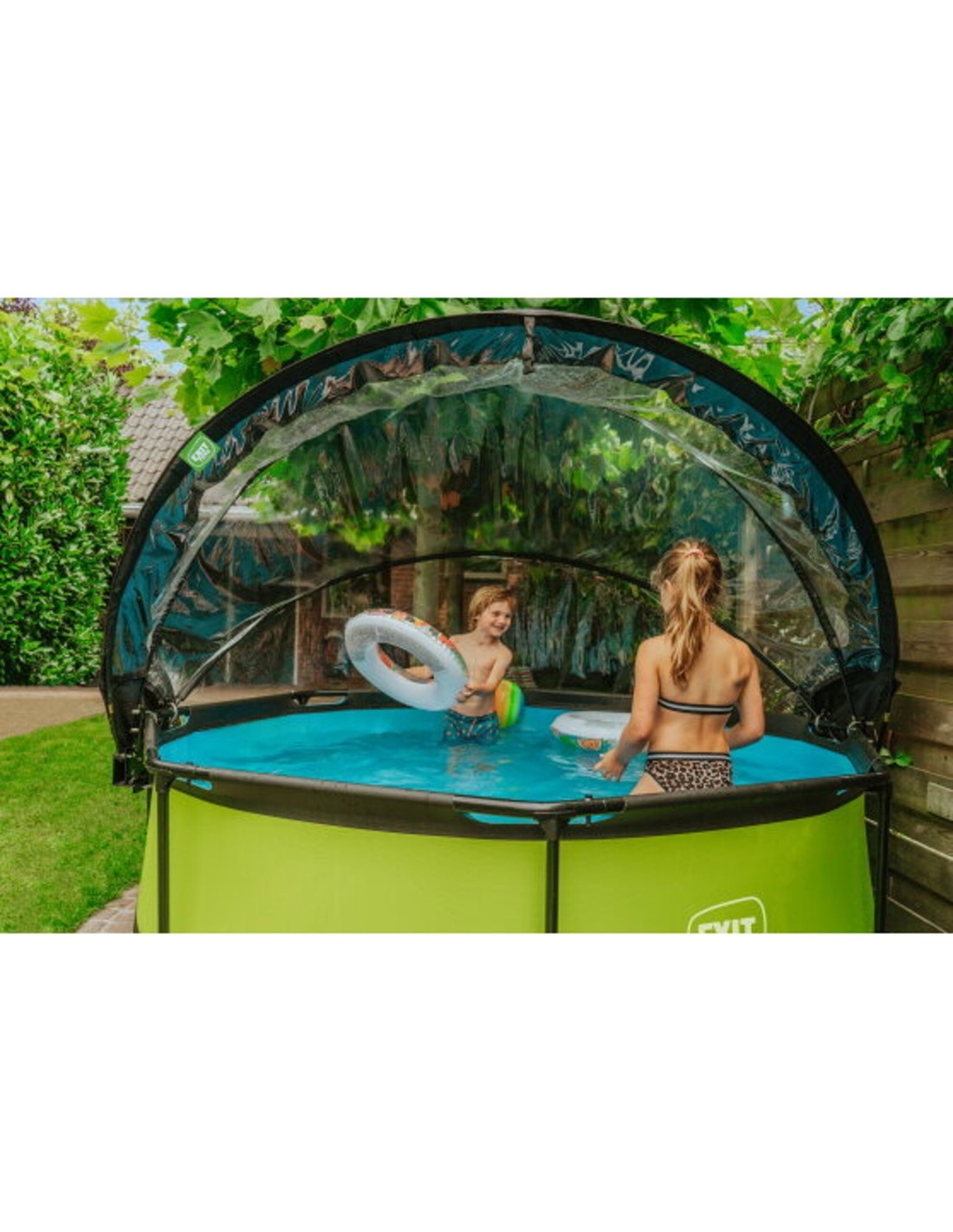 The EXIT pool dome is a multifunctional enclosure for your swimming pool. The dome is suitable for round EXIT pools and for many other frame swimming pools. With the EXIT dome for swimming pools you are no longer dependent on weather forecasts and even in less pleasant weather you can enjoy your swimming pool. The enclosure is also a sustainable solution for heating the water. When the pool is not in use, you can fasten the dome securely to the pool with the included straps. This way, no dirt will find its way into the water. The enclosure can easily be attached to the frame of the swimming pool and takes very little effort to open and close due to the unique hinge mechanism. The dome can even stay partly open, which makes it easy to get in and out of the pool. This article has been developed in accordance with our EXIT sustainable philosophy. This pool dome for example is 100% repairable. This means that every part can be replaced. In addition, the pool dome is 70% recyclable. This is because 70% mono materials have been used. These are materials that consist of just one type of raw material. These materials are easier to recycle because a separation of raw materials is not required.