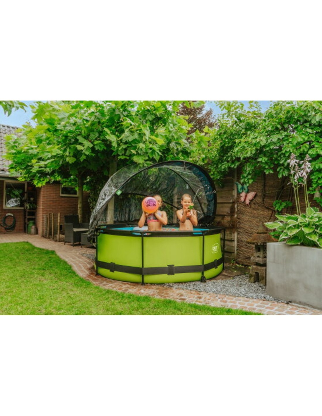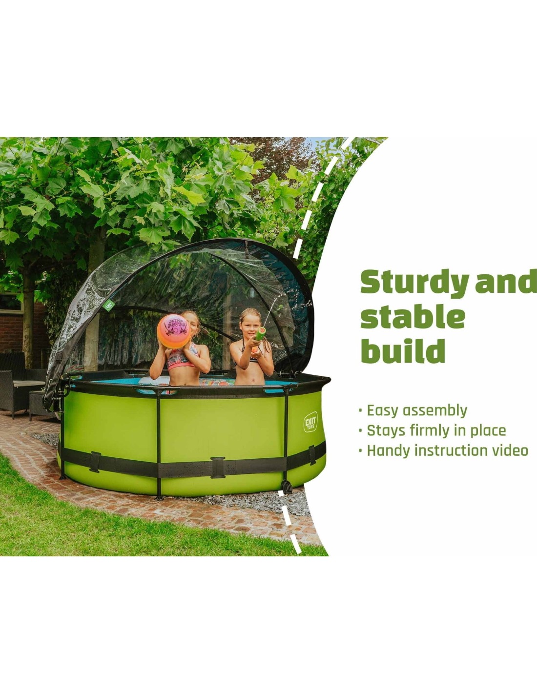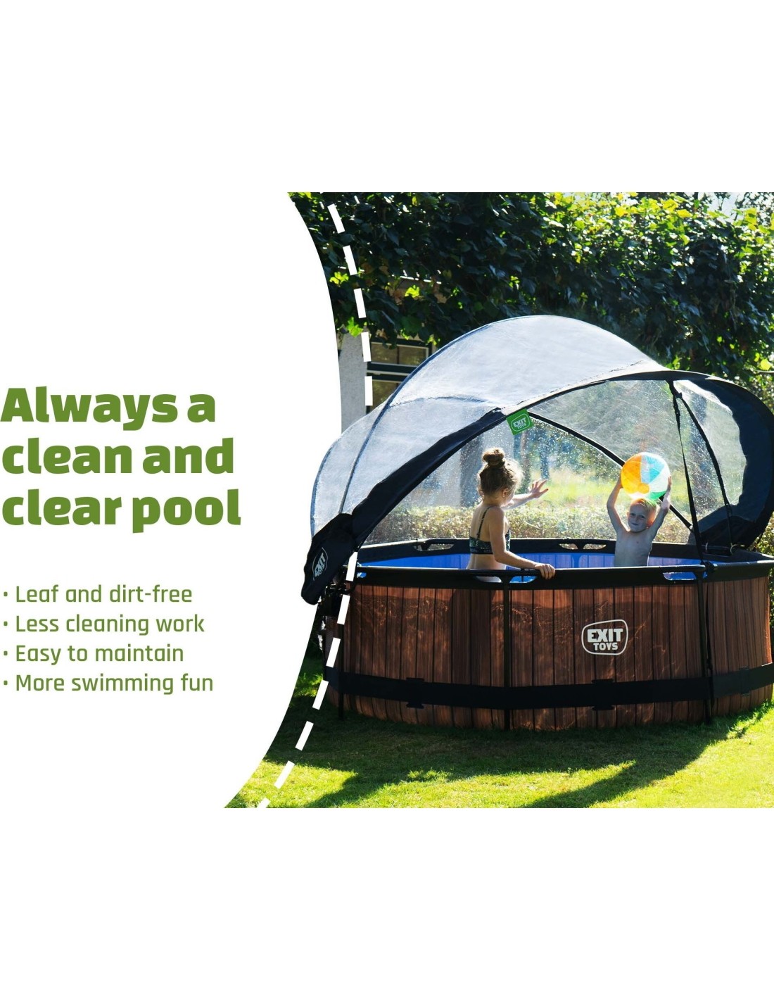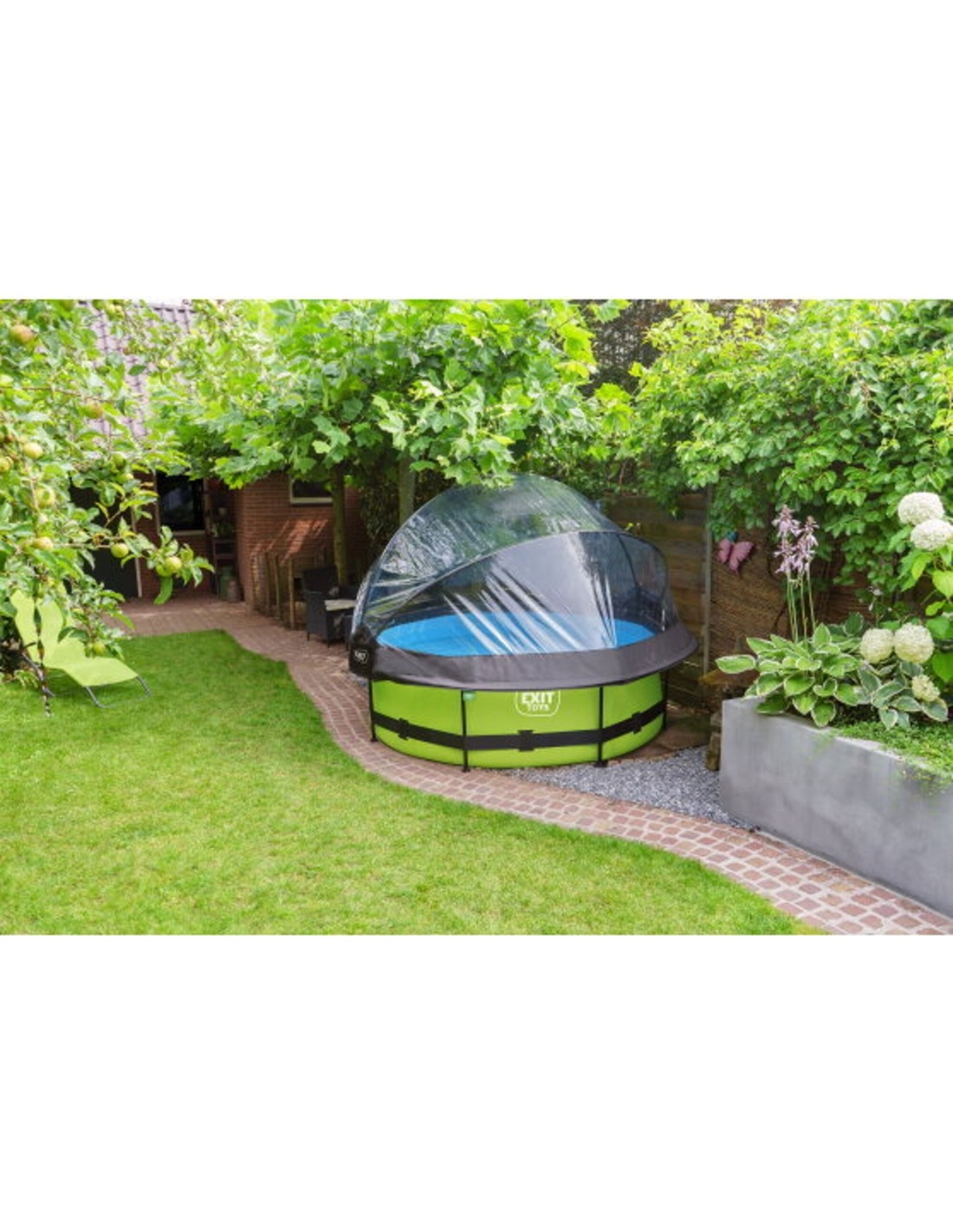 The EXIT pool dome is a multifunctional enclosure for your swimming pool. The dome is suitable for round EXIT pools and for many other frame swimming pools. With the EXIT dome for swimming pools you are no longer dependent on weather forecasts and even in less pleasant weather you can enjoy your swimming pool. The enclosure is also a sustainable solution for heating the water. When the pool is not in use, you can fasten the dome securely to the pool with the included straps. This way, no dirt will find its way into the water. The enclosure can easily be attached to the frame of the swimming pool and takes very little effort to open and close due to the unique hinge mechanism. The dome can even stay partly open, which makes it easy to get in and out of the pool. This article has been developed in accordance with our EXIT sustainable philosophy. This pool dome for example is 100% repairable. This means that every part can be replaced. In addition, the pool dome is 70% recyclable. This is because 70% mono materials have been used. These are materials that consist of just one type of raw material. These materials are easier to recycle because a separation of raw materials is not required.