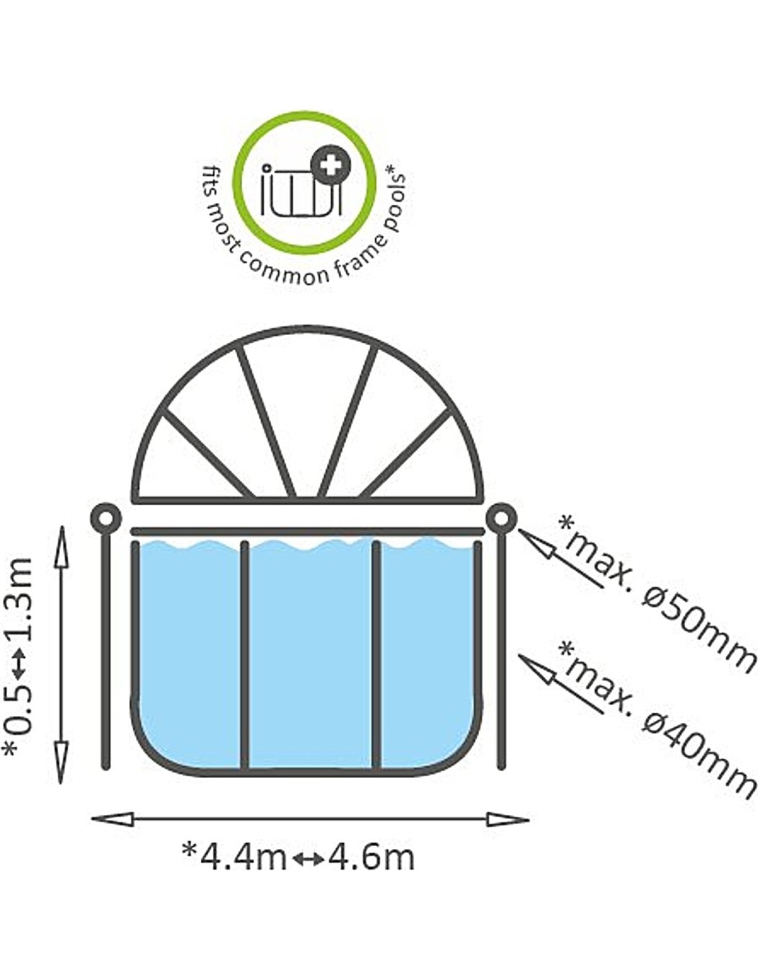 Kopuła basenowa EXIT jest wielofunkcyjną obudową dla Twojego basenu. Kopuła jest odpowiednia dla okrągłych basenów EXIT o średnicy 450 centymetrów i dla wielu innych basenów ramowych o średnicy pomiędzy 440 a 460 centymetrów. Czy chciałbyś, aby Twój basen zyskał dodatkowy akcent? Te wyjątkowe kopuły są prawdziwym atutem Twojego basenu i zagwarantują godziny zabawy i pływania, nawet gdy pogoda jest nieprzewidywalna.
