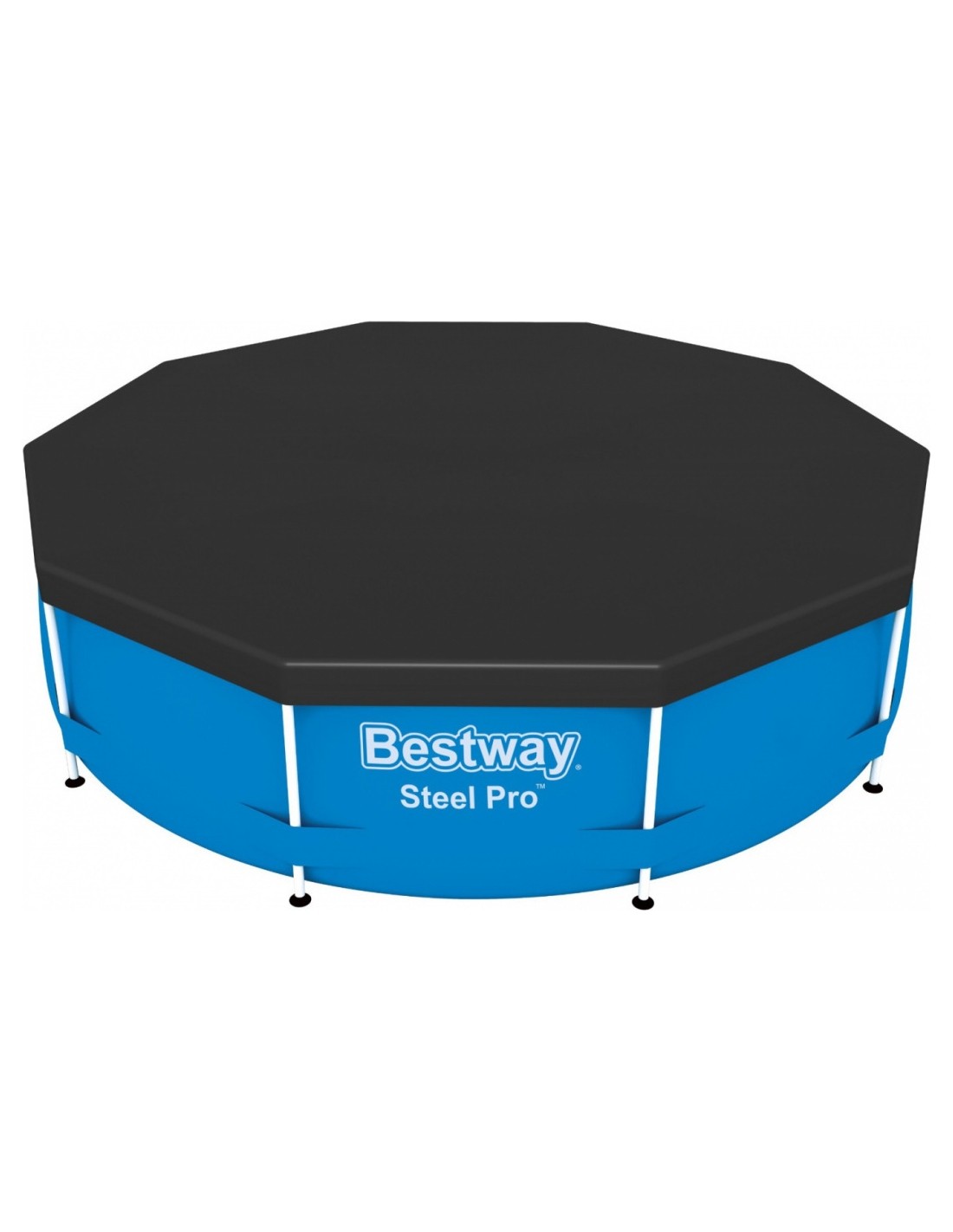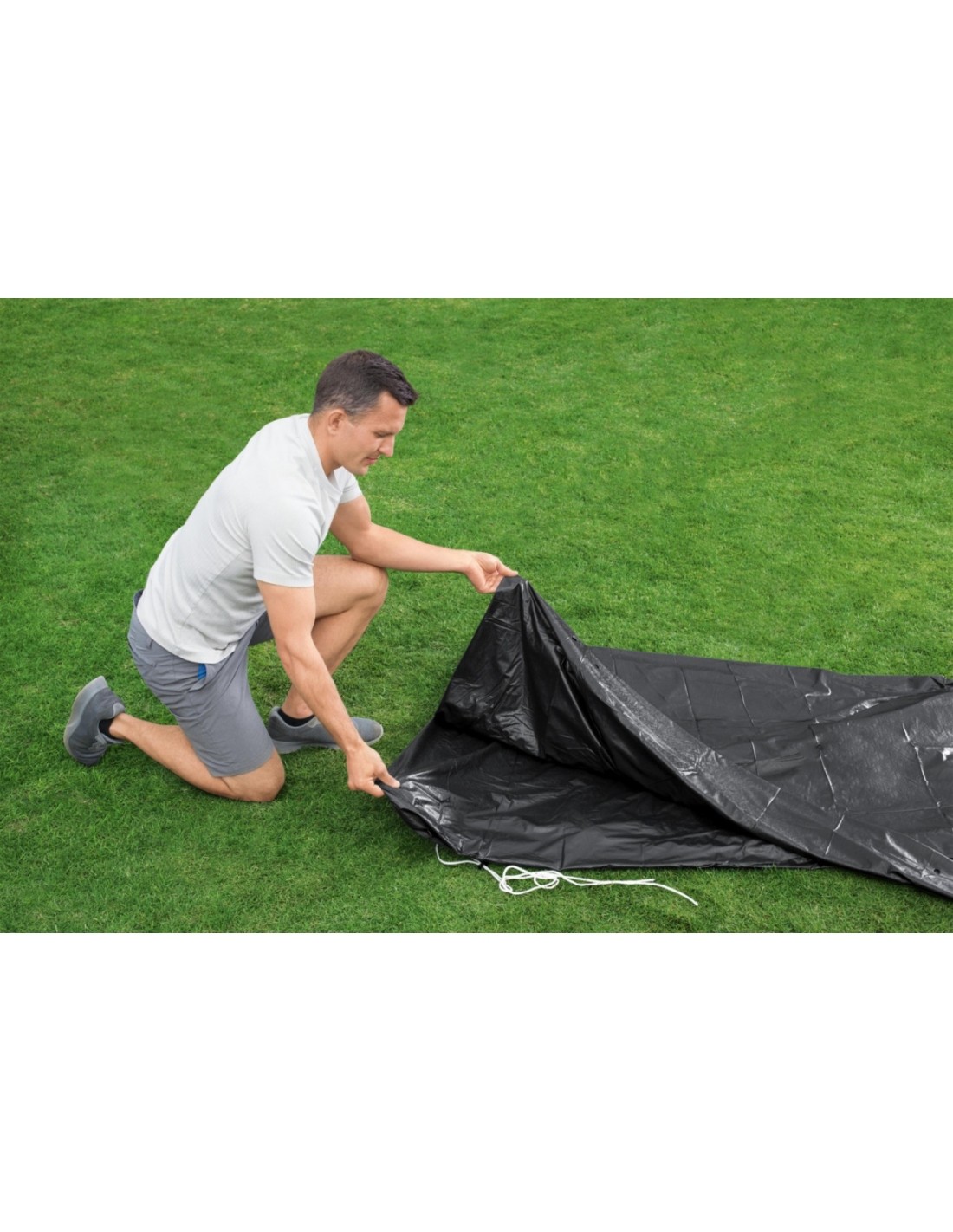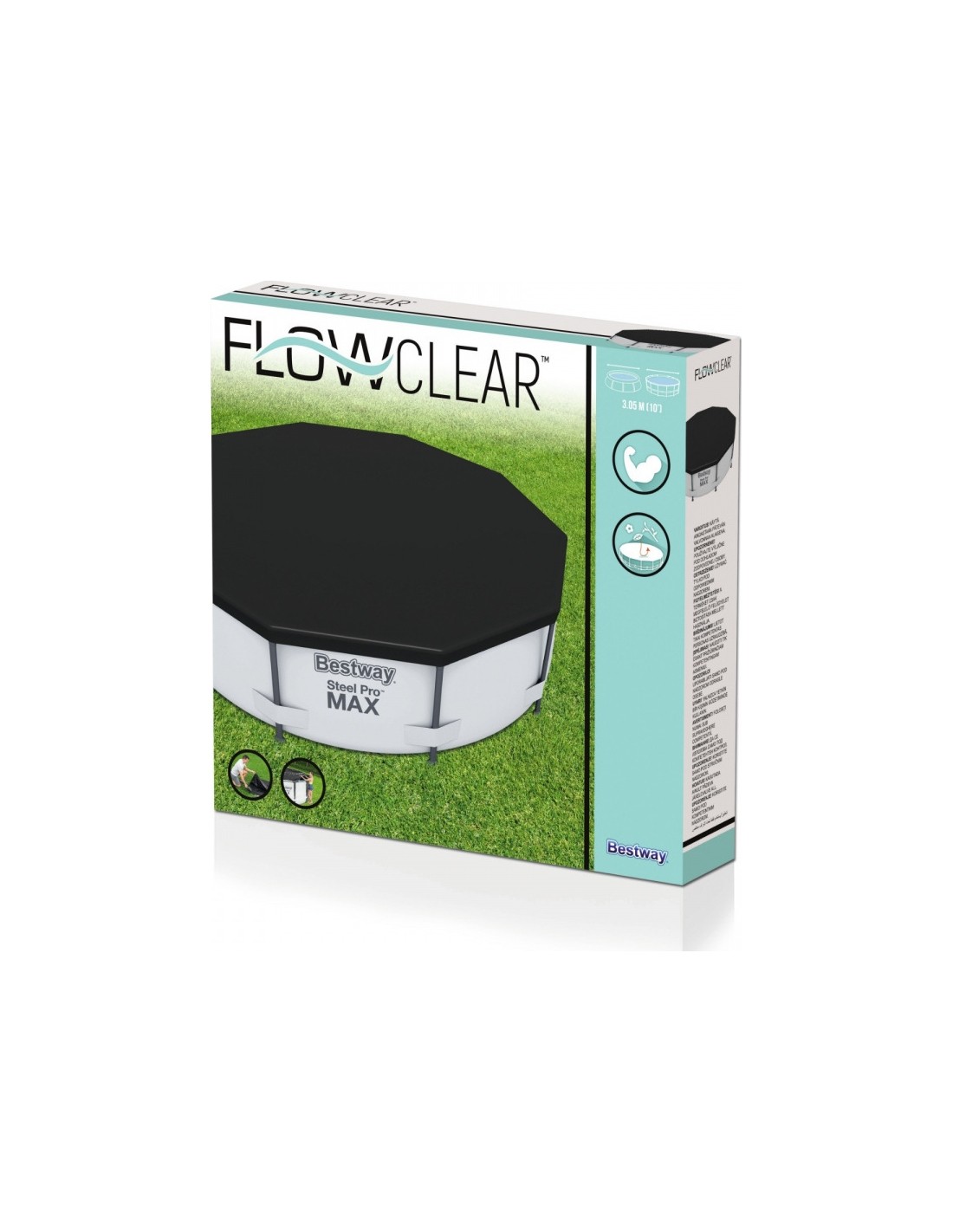 Wysokiej jakości pokrywa na baseny stelażowe o rozmiarze ok. 305 cm średnicy, wykonana jest z wytrzymałego materiału PVC. Produkt posiada linki mocujące, które gwarantują stabilność i bezpieczeństwo, a także otwory odprowadzające wodę, które zapobiegają zbieraniu się opadu na powierzchni. Opakowanie pokrywy basenowej pomoże również podczas transportu.