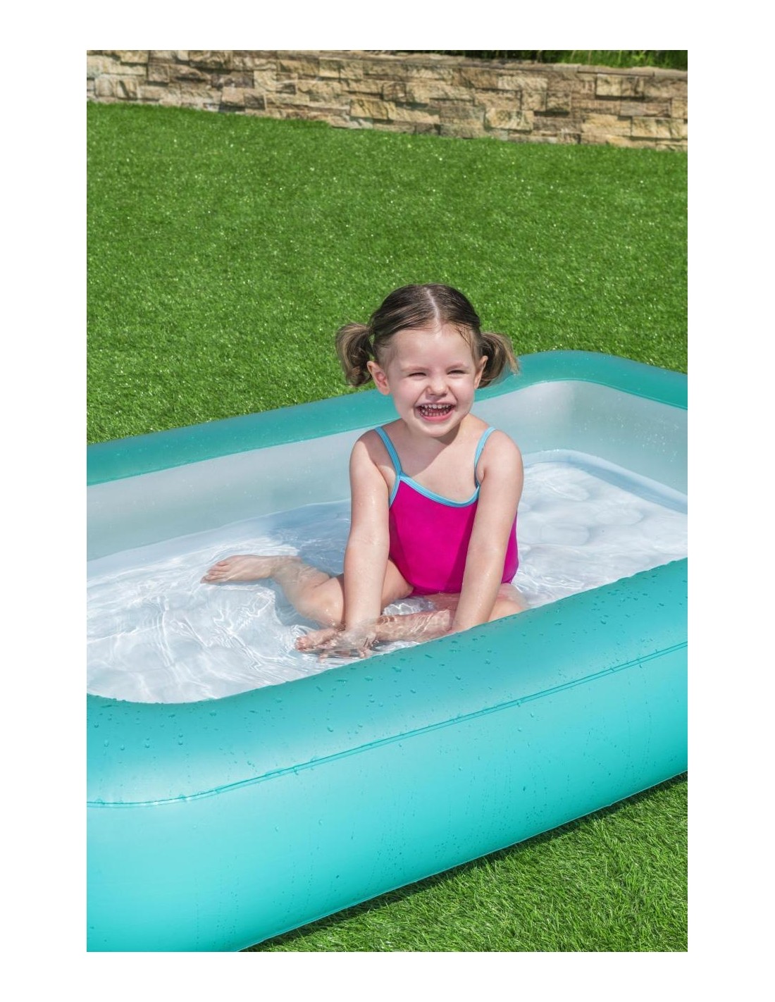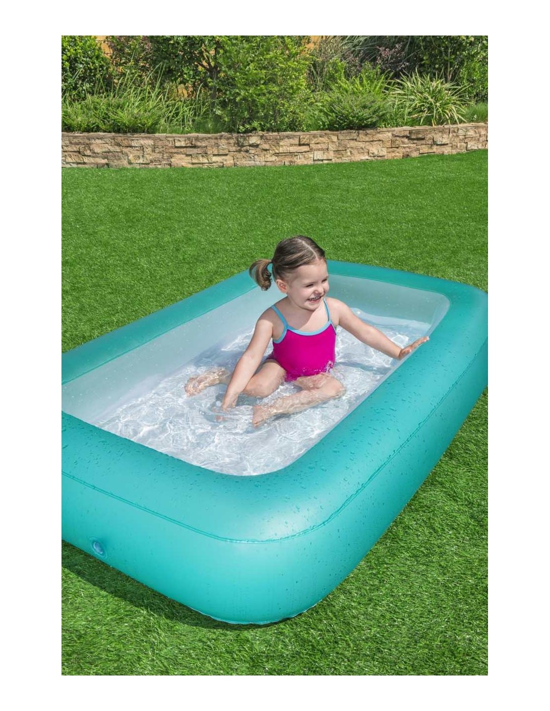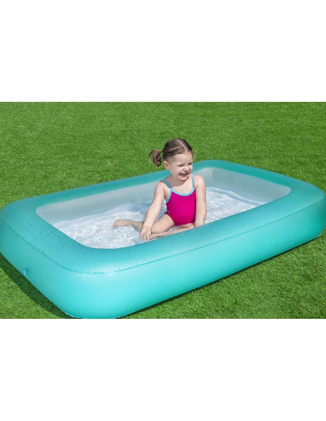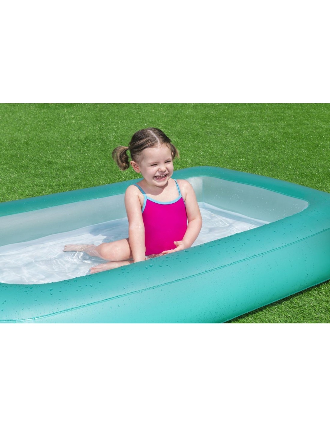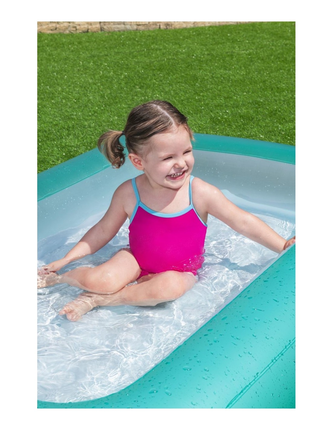 Gruba ściana basenu w turkusowym kolorze oraz miękkie, dmuchane dno gwarantują najwyższą wygodę podczas użytkowania. Dzięki swoim kompaktowym rozmiarom i łatwej konserwacji, basen jest idealnym rozwiązaniem, aby w prosty sposób zapewnić dzieciom atrakcyjną, wakacyjną rozrywkę w ogrodzie.