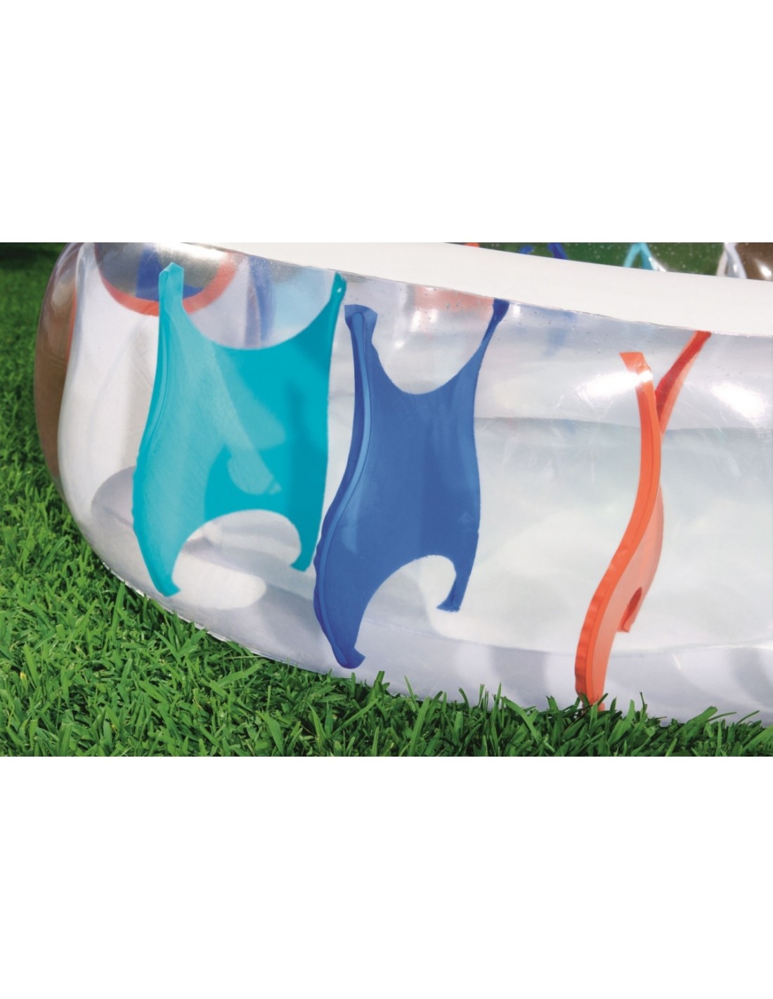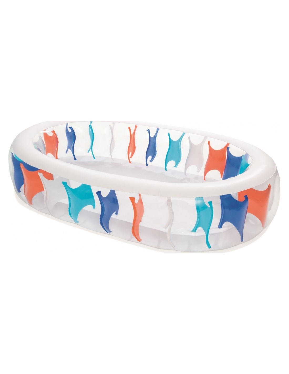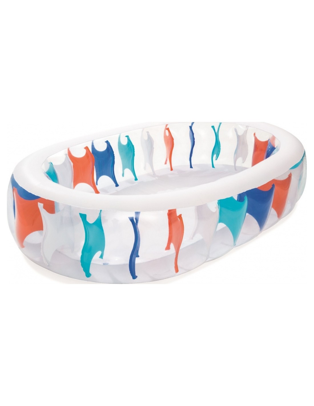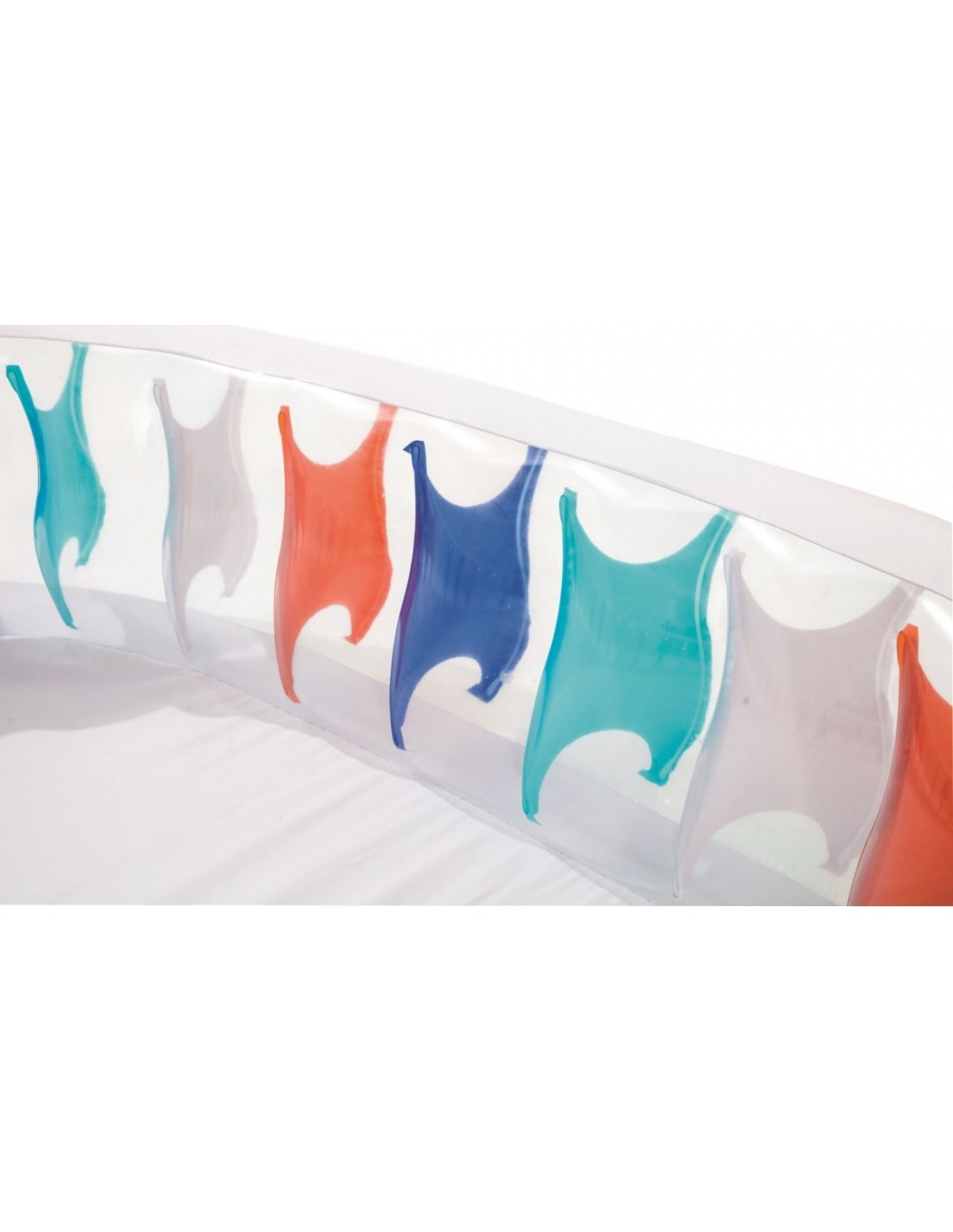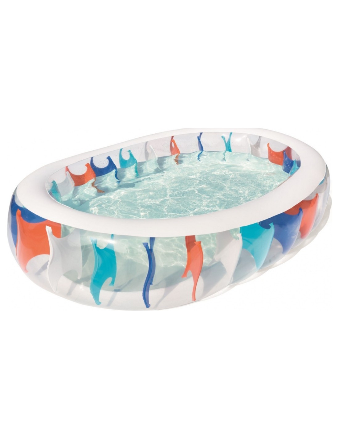 Dmuchany basen w kształcie elipsy będzie idealny dla rodzin z dziećmi powyżej 6-go roku życia. Konstrukcja basenu składa się z szerokiego, przezroczystego pierścienia do nadmuchania. Dzięki kolorowym przegrodom w kształcie litery I, które widać w środku ścianki, basen jest nie tylko stabilny, ale także atrakcyjnie wygląda.
