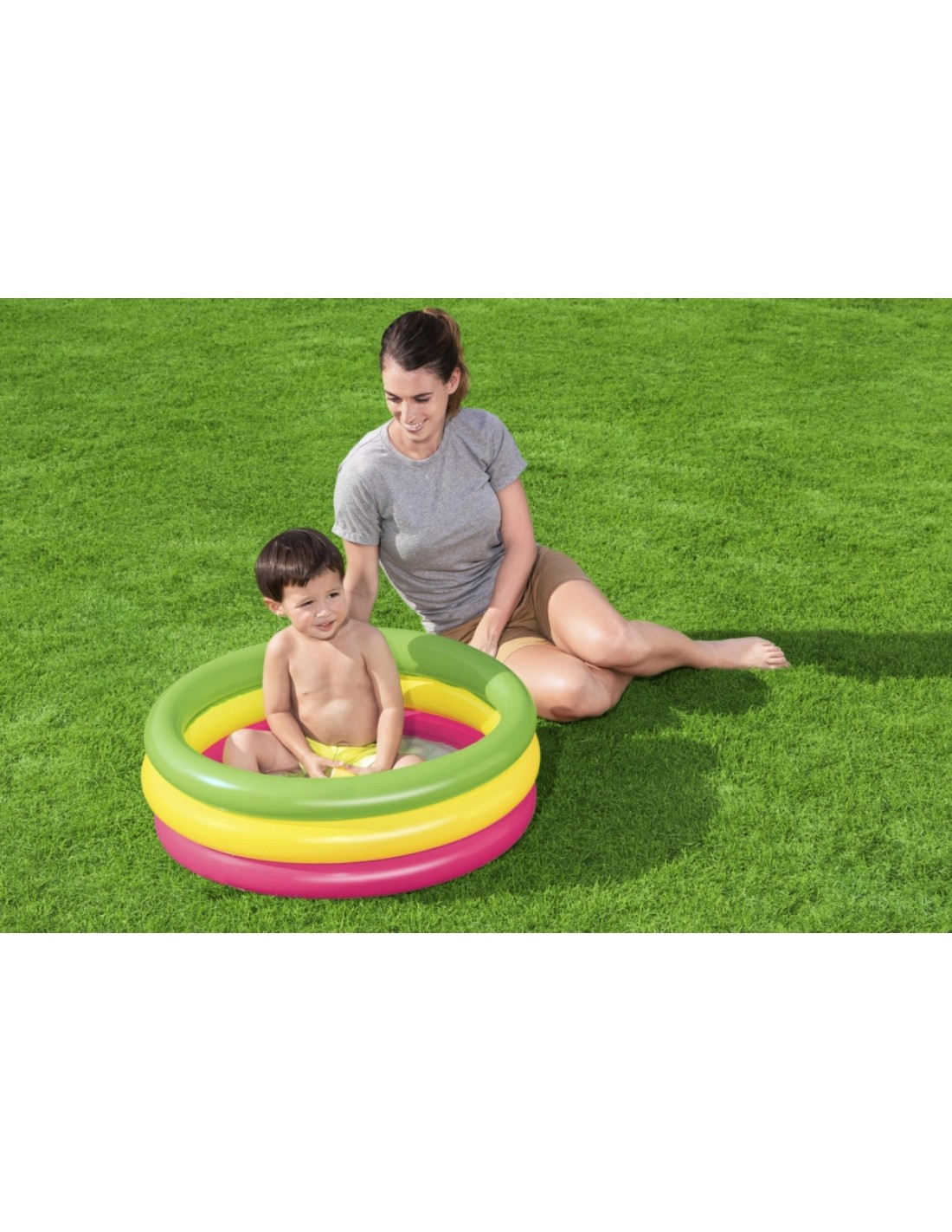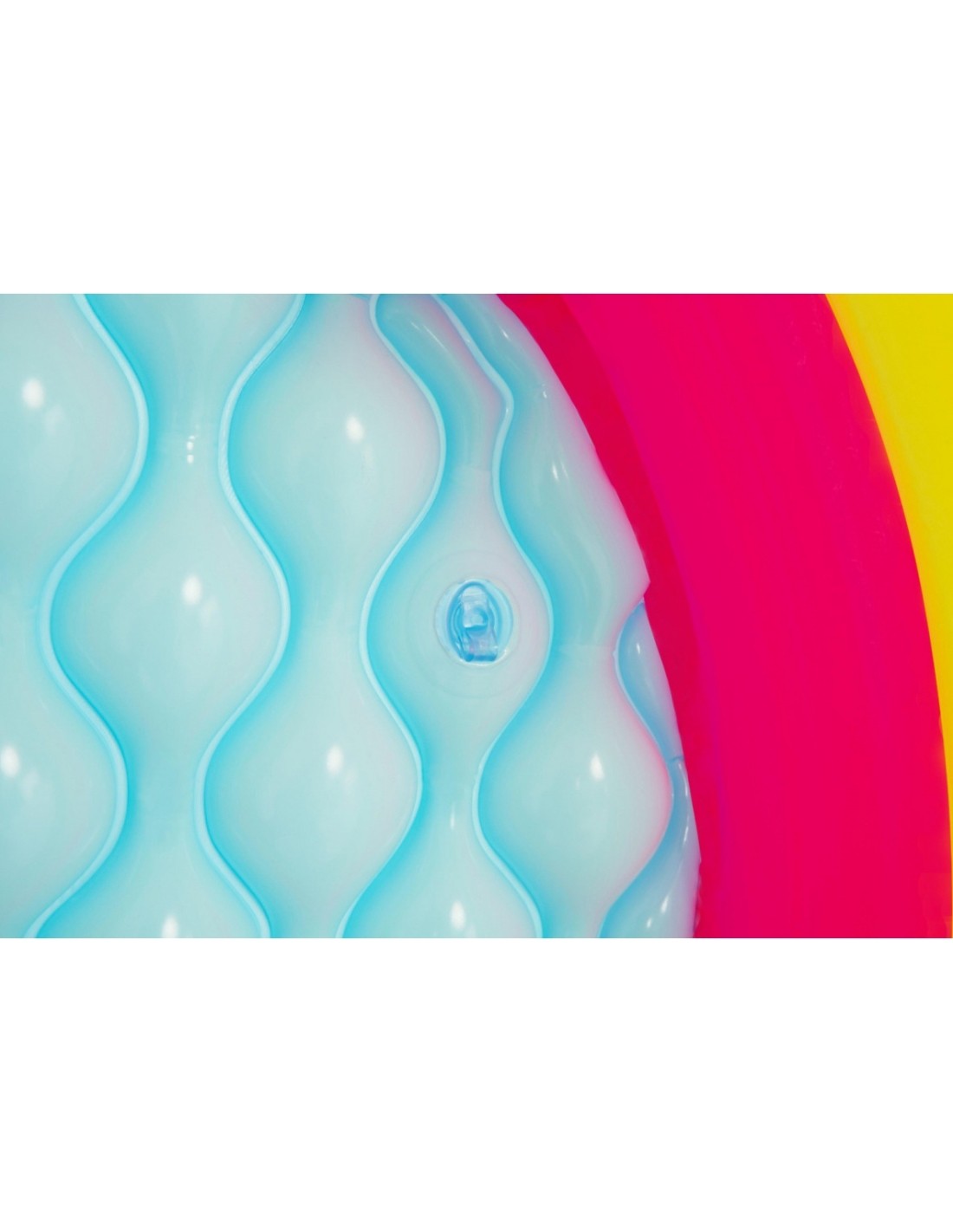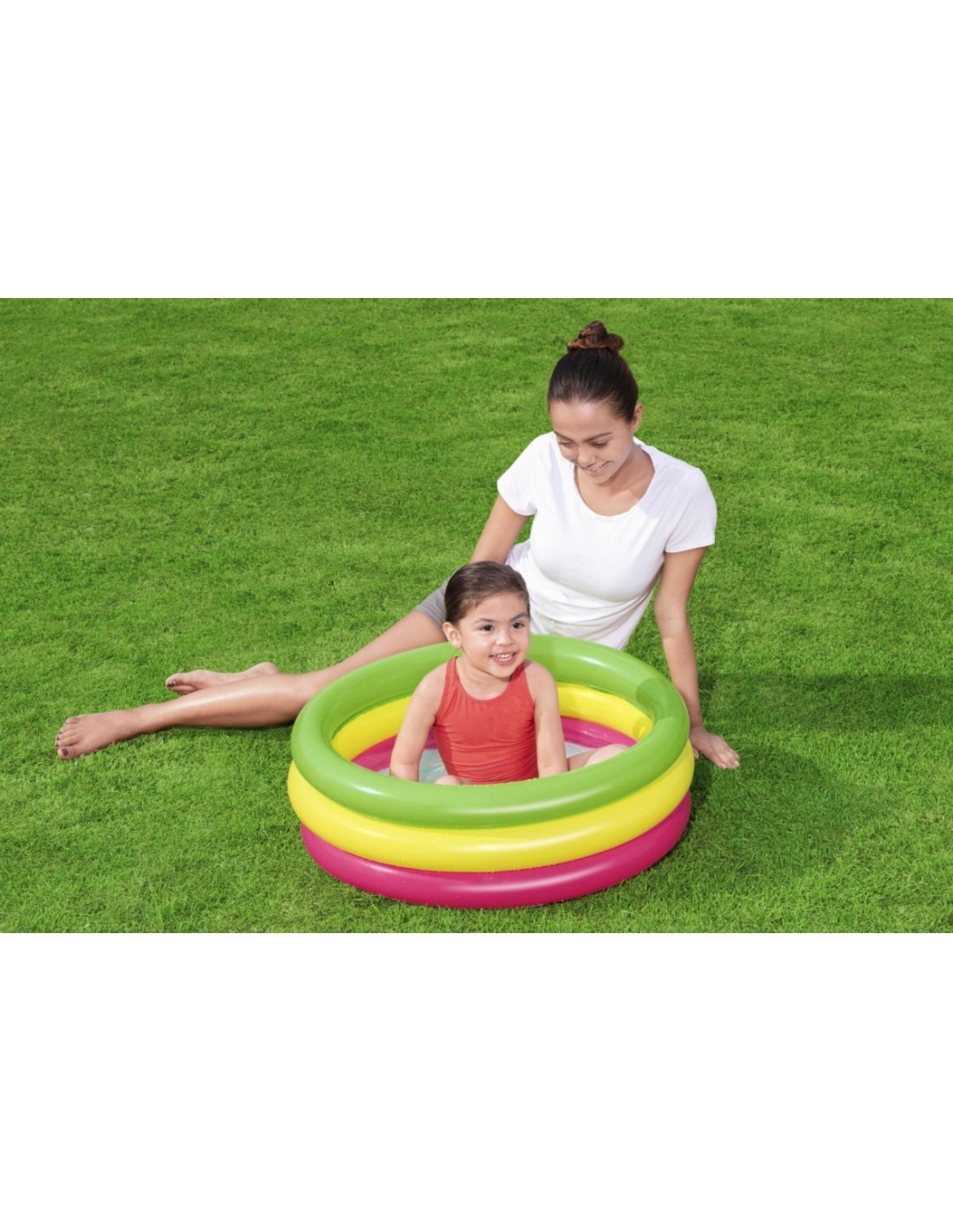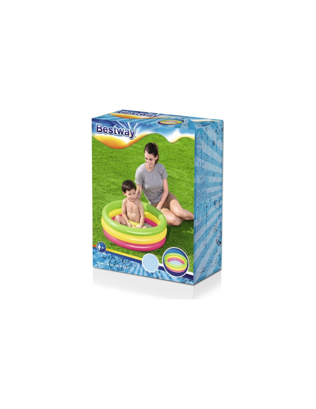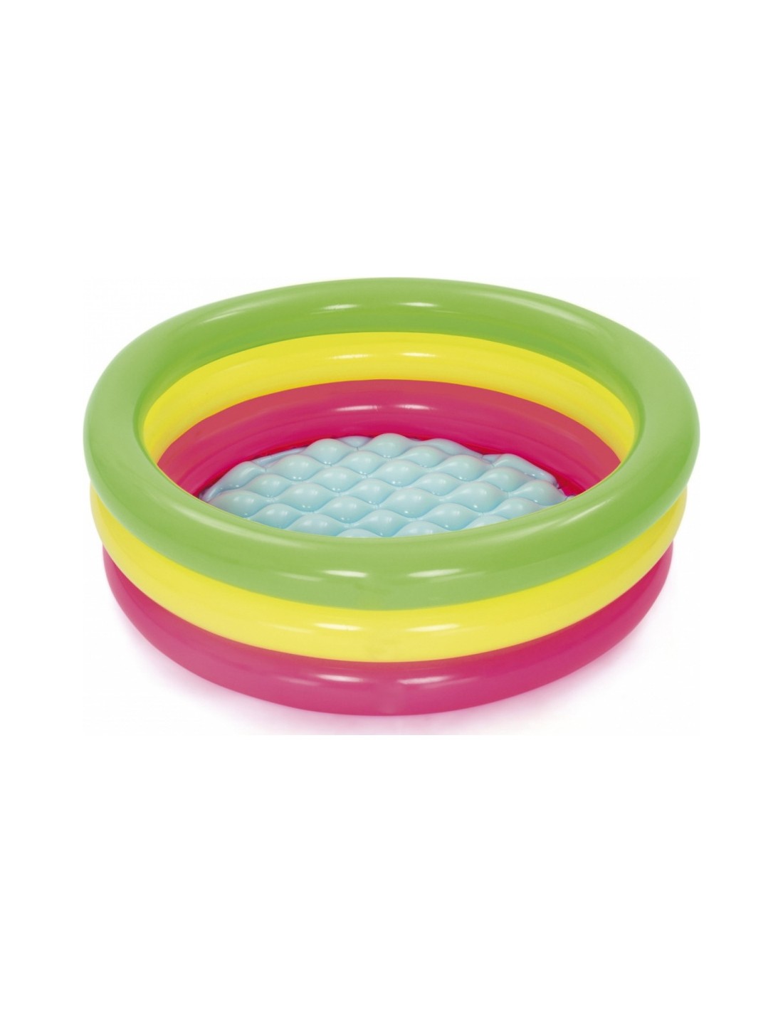 Dmuchany basen o średnicy 70 cm i wysokości 24 cm, posiada aż 3 pierścienie w neonowych kolorach tęczy. Wakacyjne kolory spodobają się dzieciom, a dmuchane, miękkie dno, zapewni im komfort użytkowania. Dzięki wykonaniu z trwałego winylu oraz zastosowaniu zaworów bezpieczeństwa, basenik jest odporny na uszkodzenia i gwarantuje udaną zabawę przez długi czas.