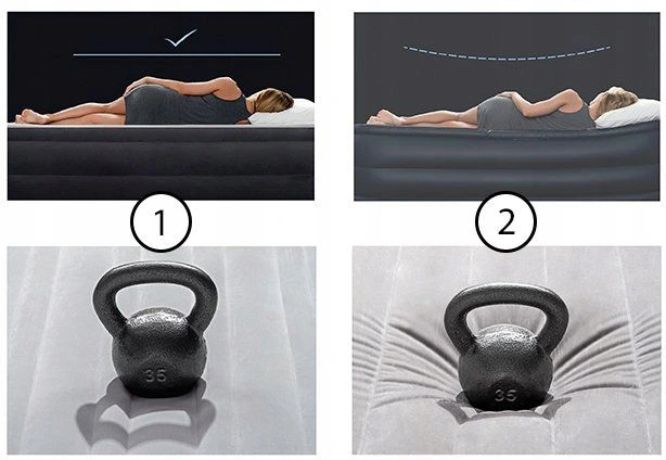Materac posiada wbudowaną pompką nożną, dzięki czemu napompujesz materac w każdych warunkach. Dodatkowo materac można pompować w tradycyjny sposób za pomocą pompki.