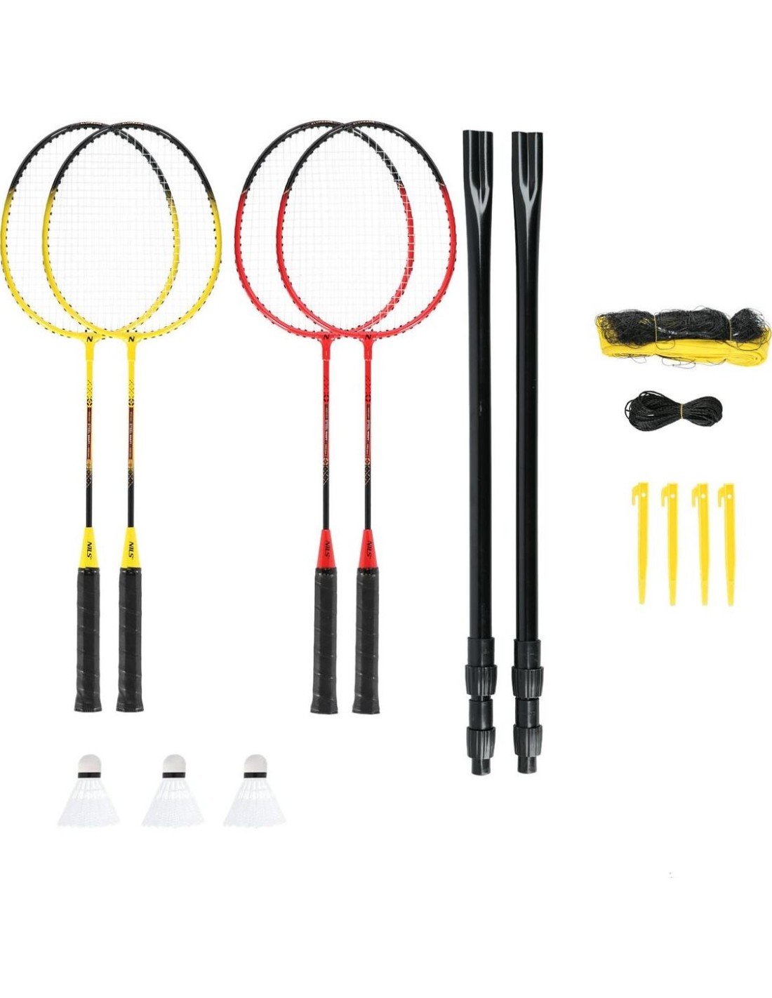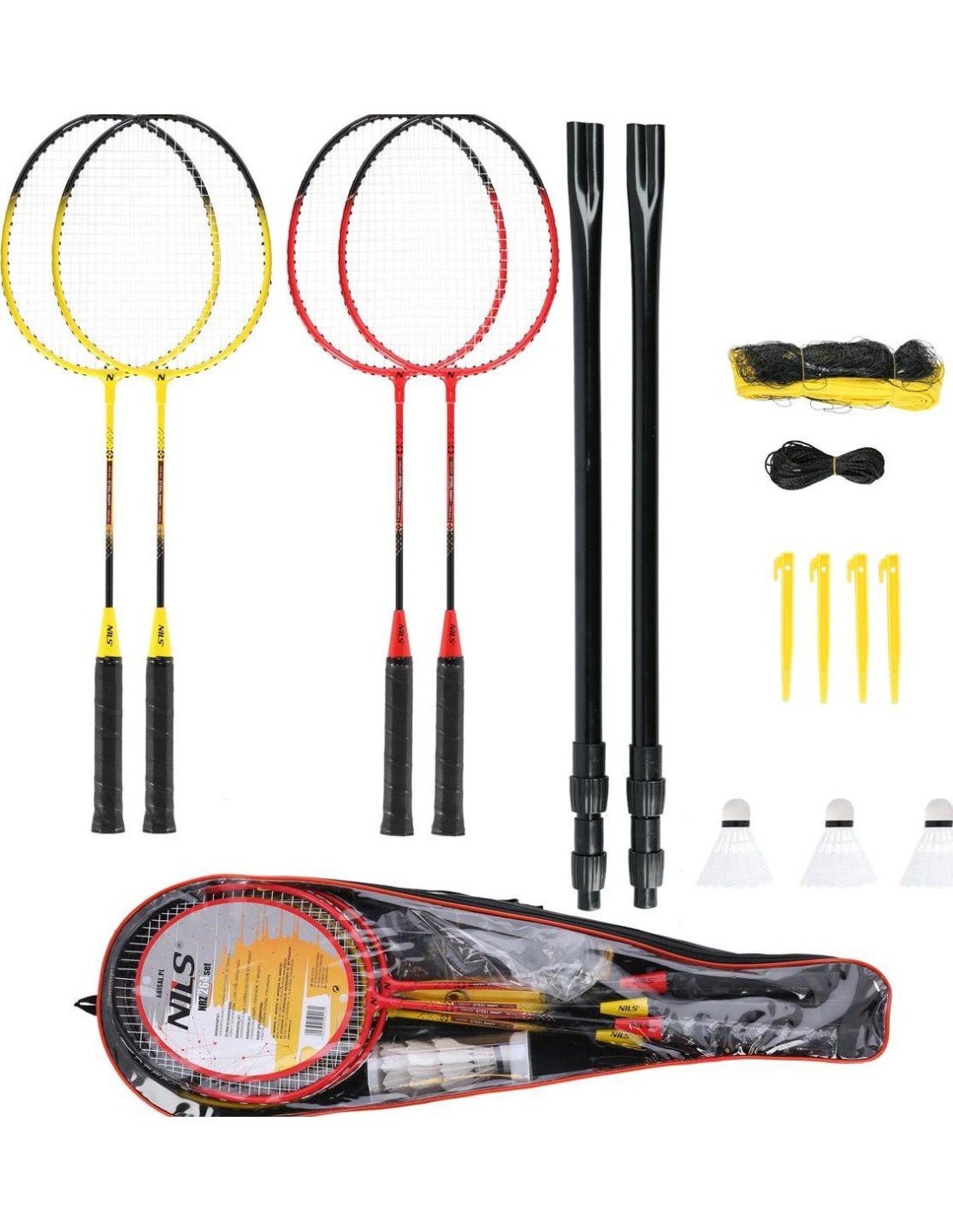 Zestaw rakietek do badmintona NILS NRZ264 Aluminium, 4 rakietki, 3 lotki, Siatka 600x60 cm, Pokrowiec