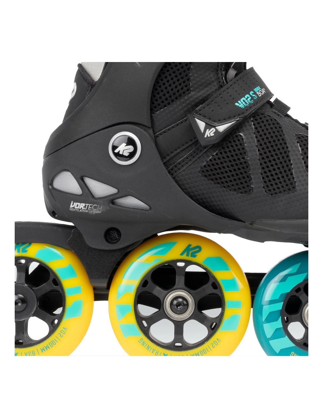 Opatentowana, jednostronna rama pozwala na lepsze przenoszenie energii ze stóp na łyżwy i oferuje o 20% lepszą amortyzację wstrząsów. Ponadto, wykonana z stopu aluminium, rama jest niezwykle lekka, tworząc idealną równowagę pomiędzy szybkością, stabilnością i wsparciem.System wentylacji Vortech firmy K2 został zaprojektowany, aby stopy były chłodne i suche, podczas gdy wzmocnienie pięty Flex Notch zapewnia lepszy zakres ruchu podczas odepchnięcia. Ten model został zaprojektowany do szybkiej jazdy!