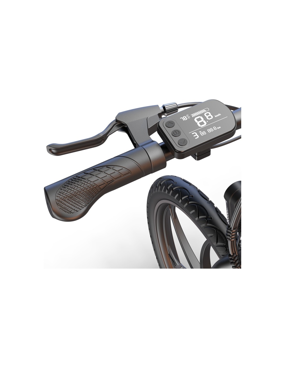 Elektrinis dviratis turi patogų ir ypač informatyvų LCD ekranėlį, kuriame visuomet važiavimo metu galėsite matyti ir sekti savo važiavimo greitį, nuvažiuotą atstumą, el. dviračio mynimo pagalbos lygį (pavarą) bei likusią baterijos įkrovą. Taip pat galėsite reguliuoti funkcijas, įjungti žibintus ir keisti pavaras trimis patogiais mygtukais.