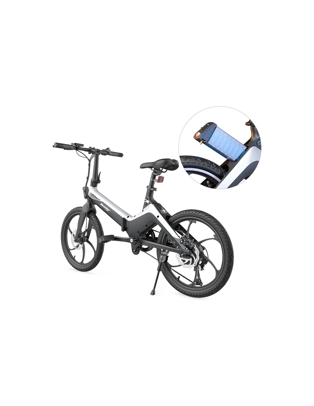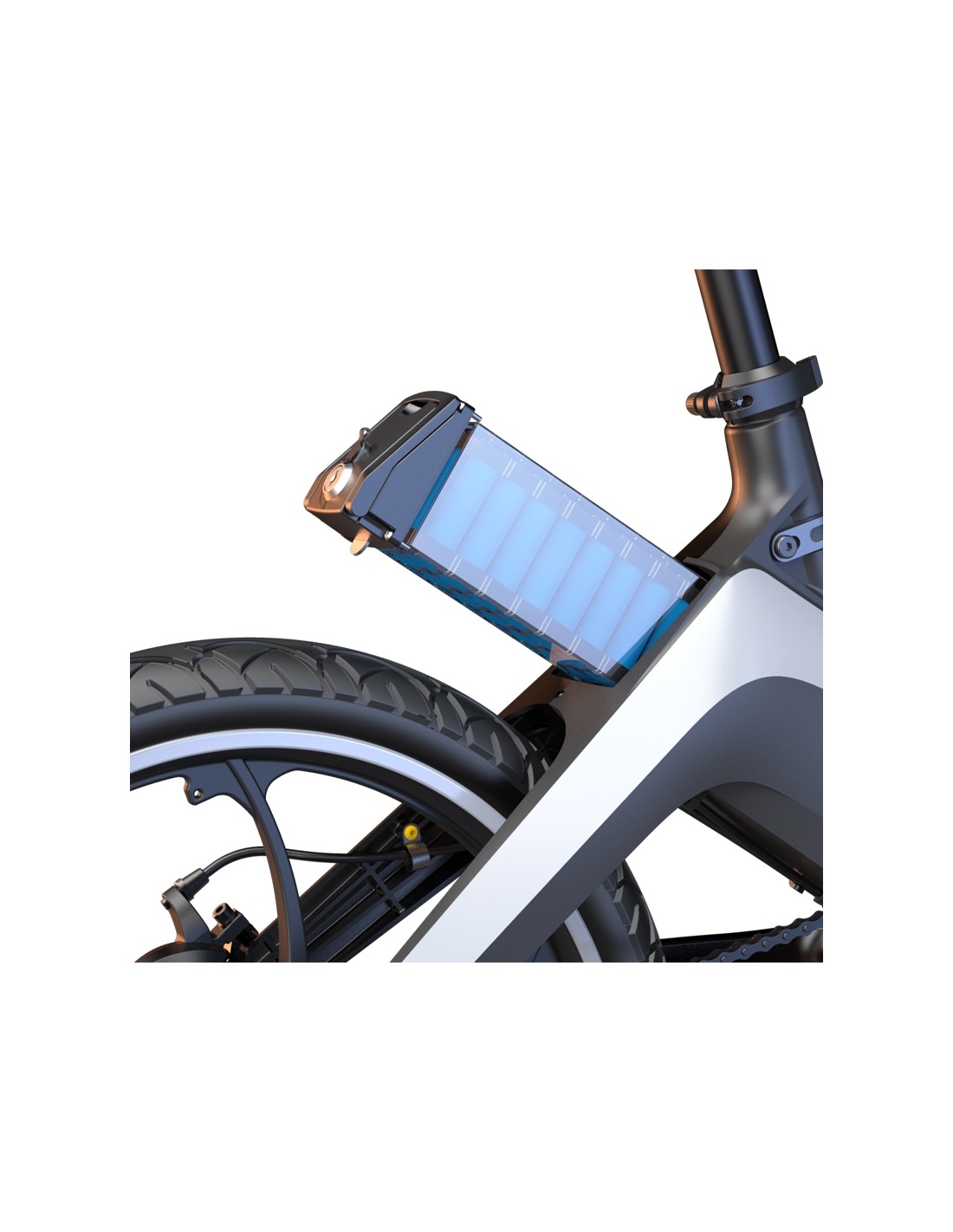 Šis prietaisas turi talpią išimamą 36 V, 8 Ah bateriją. Tai ypač pravartu norint elektrinį dviratį taisyti, pervežti, palikti ilgesniam laikui nenaudojamą ar be priežiūros, kad išvengtumėte prietaiso variklio galimo įsijungimo ar neteisėto naudojimo. Taip pat ši funkcija nepamainoma, norint įkrauti bateriją, kai dviratis laikomas kitoje patalpoje, kur nėra el. tinklo lizdo.