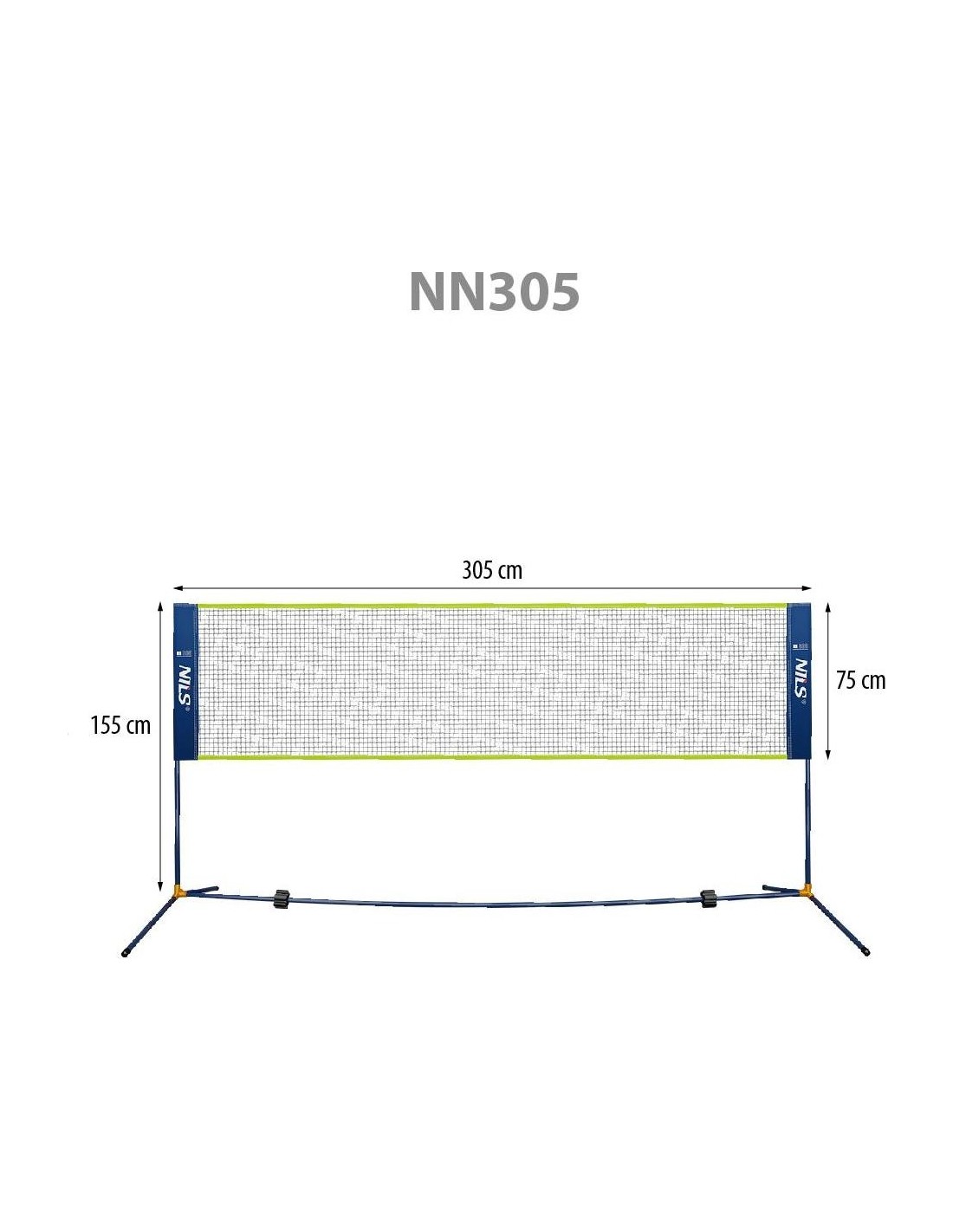 NN305 Nils, to siatka przeznaczona do rekreacyjnej gry w badmintona. Będzie świetnym dodatkiem, do wykorzystania przy klasycznych grach na świeżym powietrzu. Siatkę rozkłada i składa się w kilka minut, bez pomocy narzędzi. Dzięki środkowej poprzeczce, łączącej zewnętrzne słupki, konstrukcja jest bardzo stabilna i wytrzymała. Mocna siatka i solidny stelaż, są odporne na warunki atmosferyczne. Nie trzeba jej specjalnie mocować do podłoża (jest wolnostojąca), więc może być wykorzystywana także na hali. Specyfikacja: Wymiary: 3.05 m x 1.55 m Materiał: SIATKA: poliester STELAŻ: 25mm x 1,2mm stalowe rurki Uwagi: Nie przeznaczona do użytku komercyjnego Gwarancja 24 miesiące