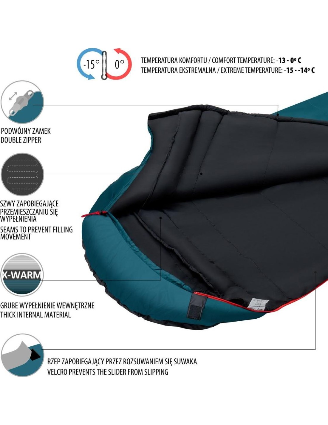 One of the key features of the NC2005 sleeping bag is its excellent thermal insulation. Thanks to the use of advanced insulation materials, this sleeping bag keeps you warm inside, even in the most demanding weather conditions. Even when the outdoor temperature is below zero degrees Celsius, you can sleep peacefully, in full warmth and comfort. For even greater comfort of use, the sleeping bag has special stitching to prevent the filling from moving. The NC2005 sleeping bag has also been designed with practicality and comfort of use in mind. Equipped with a special zipper system, it allows easy and quick entry and exit, without undue worry about jamming or blocking the zipper. Thanks to the appropriate design and ergonomic shape, it ensures freedom of movement and maximum comfort during sleep.