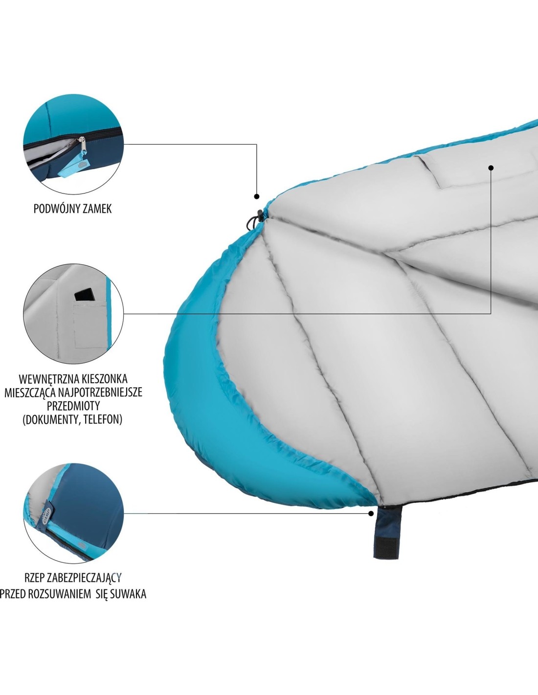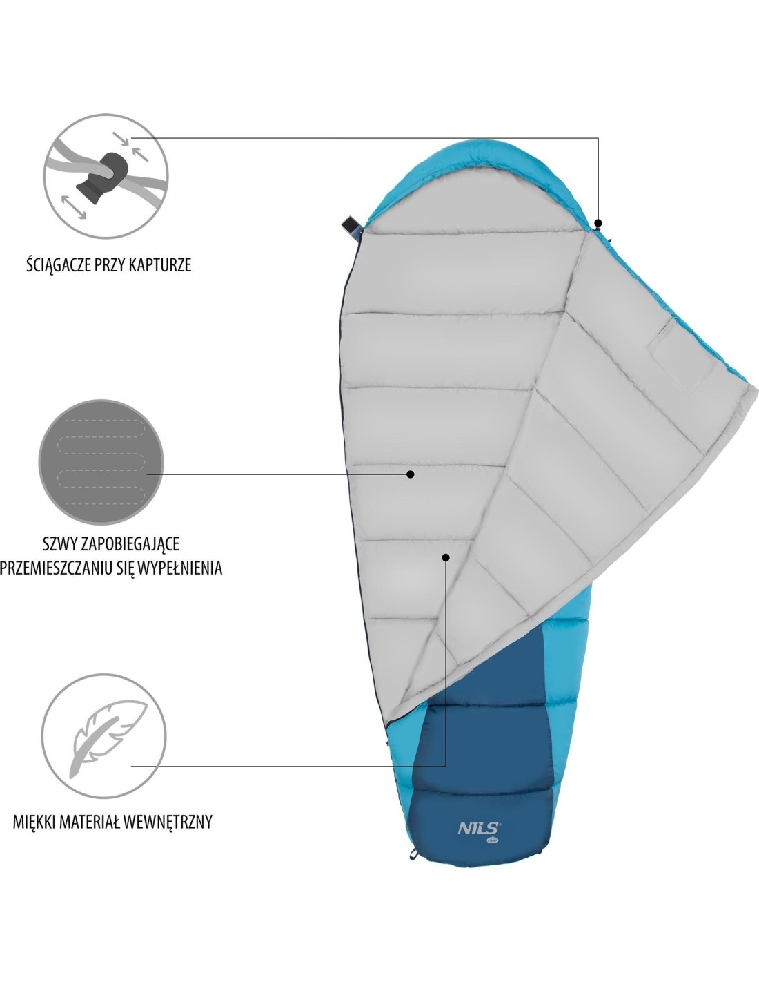 It is characterized by a very good quality and the best materials. The filling is a unique Hollow fiber technology and the outer material is a durable, modern polyester fabric. Additionally, they are covered with a coating resistant to the cold and the moisture. This results in a calm and comfort sleep, even at very low temperatures close to zero Celsius degrees. For greater comfort of use the sleeping bag is characterized by special stitching preventing the filling from dislocation. Additionally, the hood located in the upper part guarantees a stable position of the pillow due to pullers. NC2012 is fastened with a zipper, and hooks and loops placed at the end of the sleeping bag additionally protects the sleeping bag from opening. The zipper is double-sided which means you can operate it also from the inside.