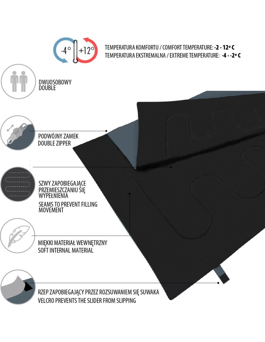 It is characterized by a very good quality, the best materials and large size (for two persons). Both the filling and the outer material are durable, modern polyester fabrics. Additionally, they are covered with a coating resistant to the cold and the moisture. This results in a calm and comfort sleep, even at very low temperatures close to zero Celsius degrees. For greater comfort of use the sleeping bag is characterized by special stitching preventing the filling from dislocation. NC2001 is fastened with a zipper, and velcro placed at the end of the sleeping bag additionally protects the sleeping bag from opening.