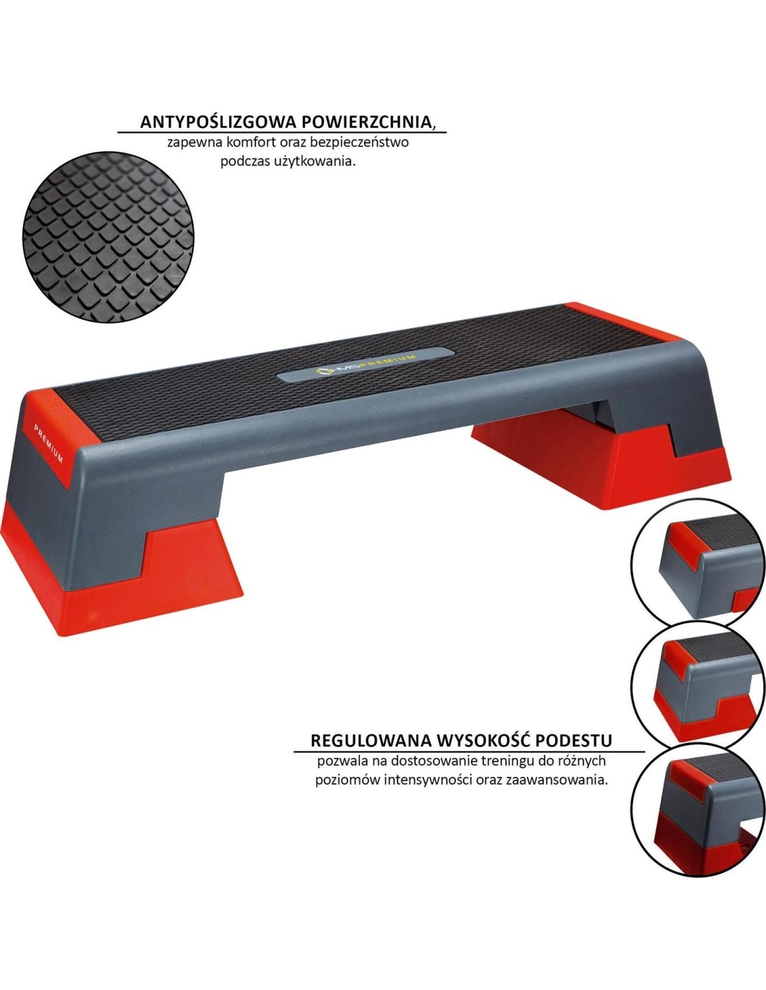 The step has a non-slip surface, ensuring that you can move confidently even during dynamic exercises. Rubber feet prevent the step from slipping on different surfaces, guaranteeing stability and safety of use.