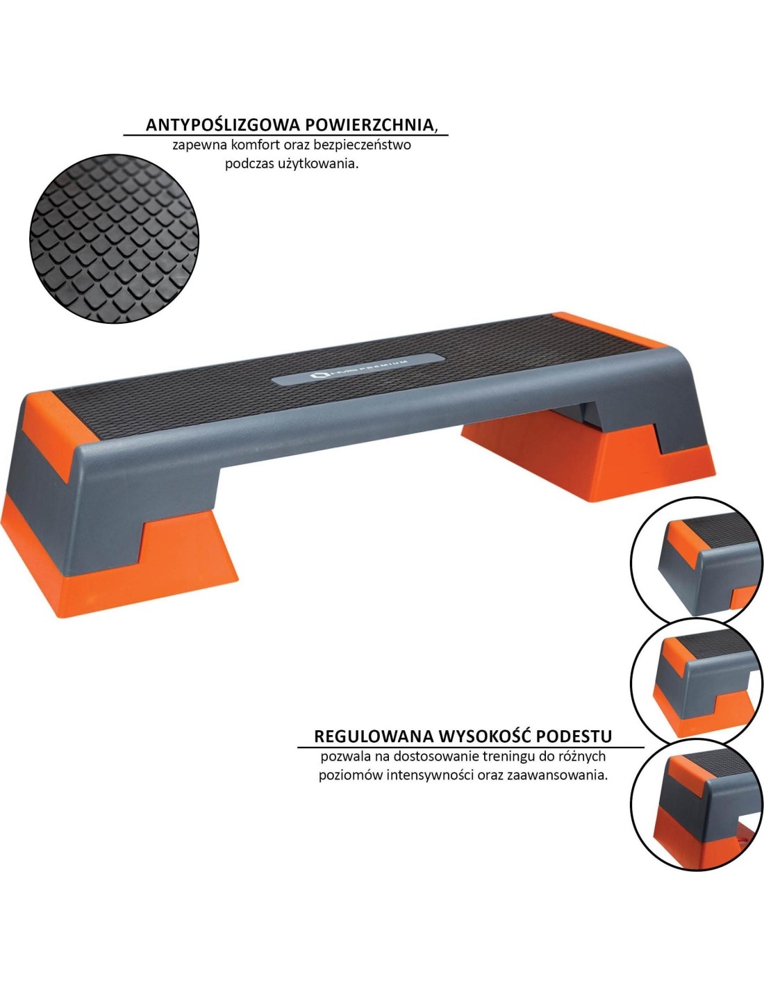 Regulowana wysokość podestu pozwala na dostosowanie treningu do różnych poziomów intensywności oraz zaawansowania. Kolejnym atutem jest antypoślizgowa powierzchnia, która zapewni komfort oraz bezpieczeństwo podczas użytkowania.