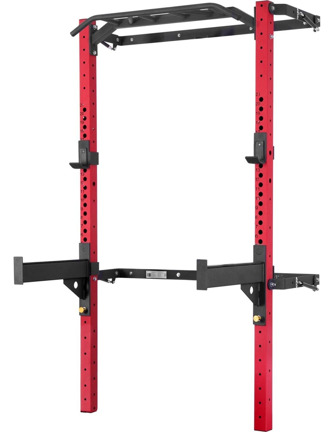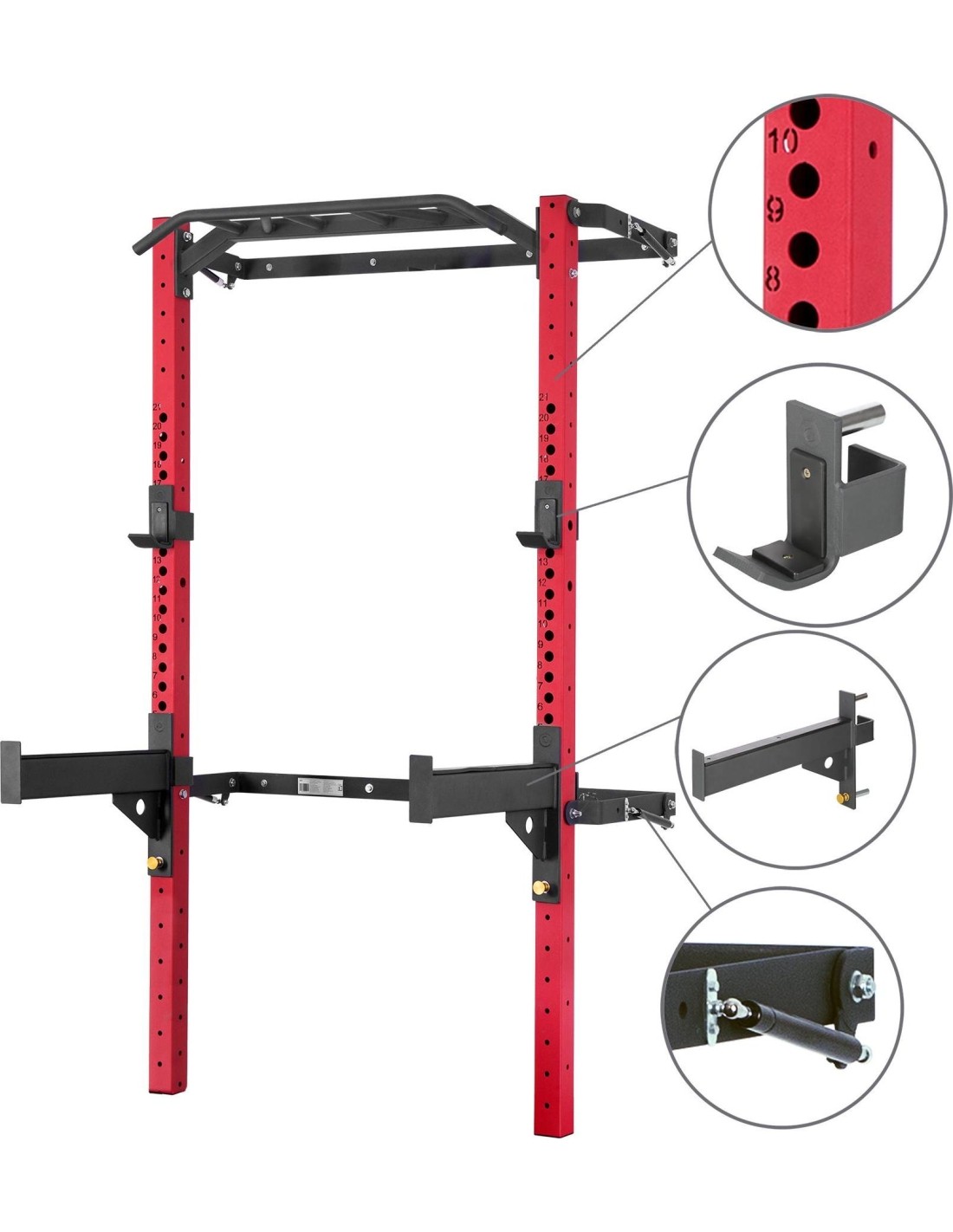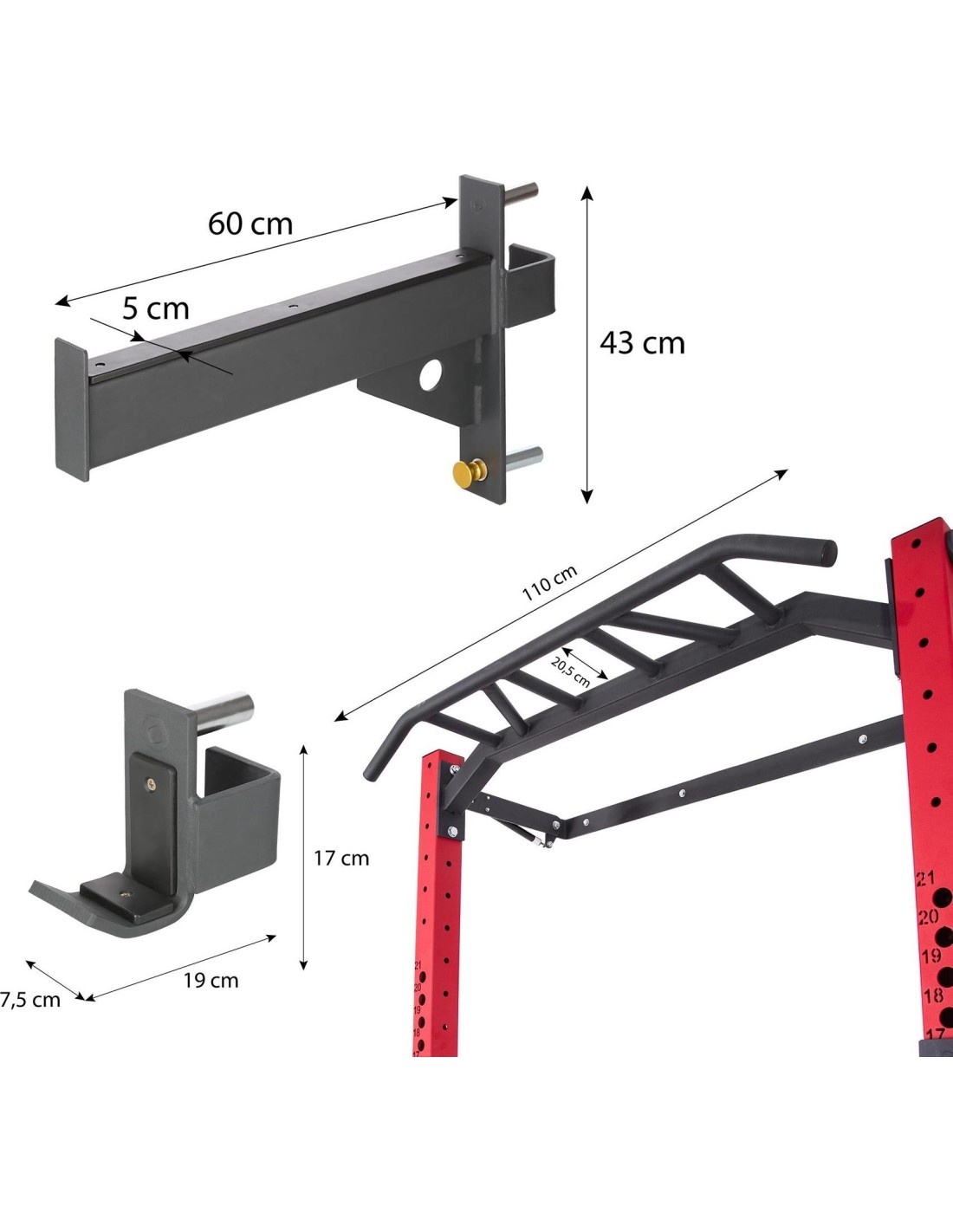 The cage has a multifunctional pull-up bar that allows you to develop your back, shoulder and chest muscles thanks to the different grip options. Pull-ups are one of the best exercises for the upper body, as they engage multiple muscle groups and improve joint mobility. To simplify this exercise, simply use special resistance bands. On the KLT23 you will also find two griffin hooks that you can mount at any height.