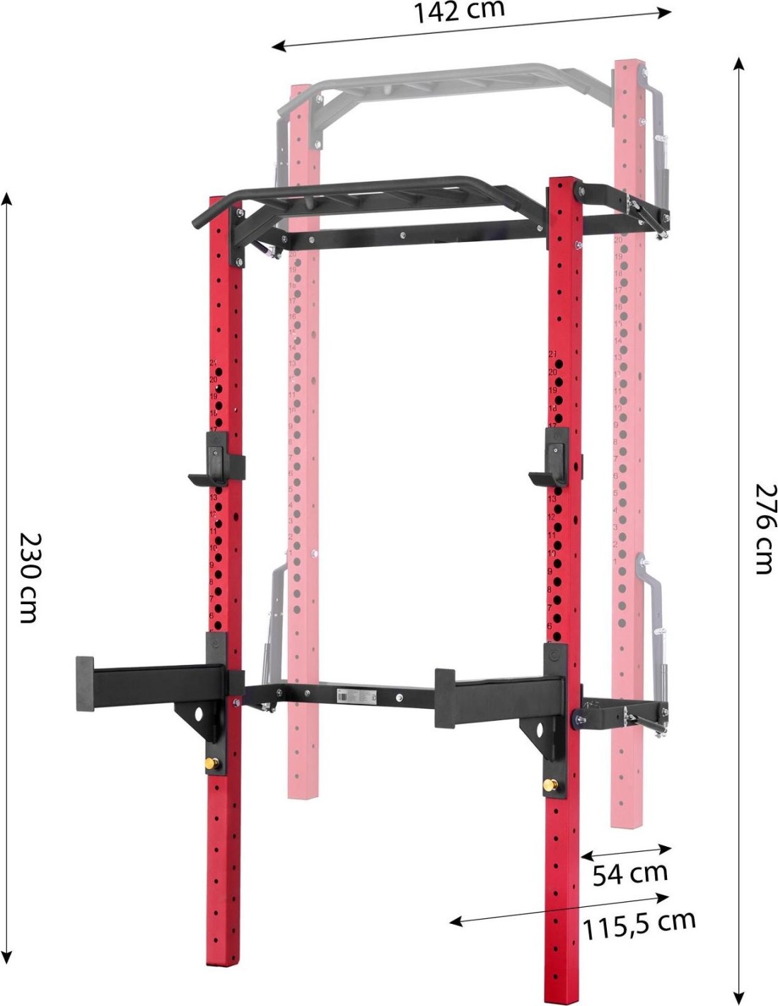 On the KLT23 you will also find special supports that you can attach to the frame of the cage to ensure maximum safety when training with heavy weights. The supports can be attached at any height and used when performing exercises such as bench presses or barbell squats, without worrying about dropping the weight. With the supports on the KLT23, you can push the limits of your own strength.