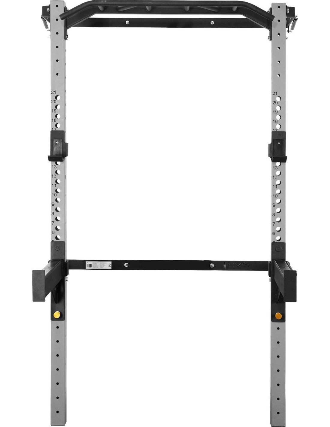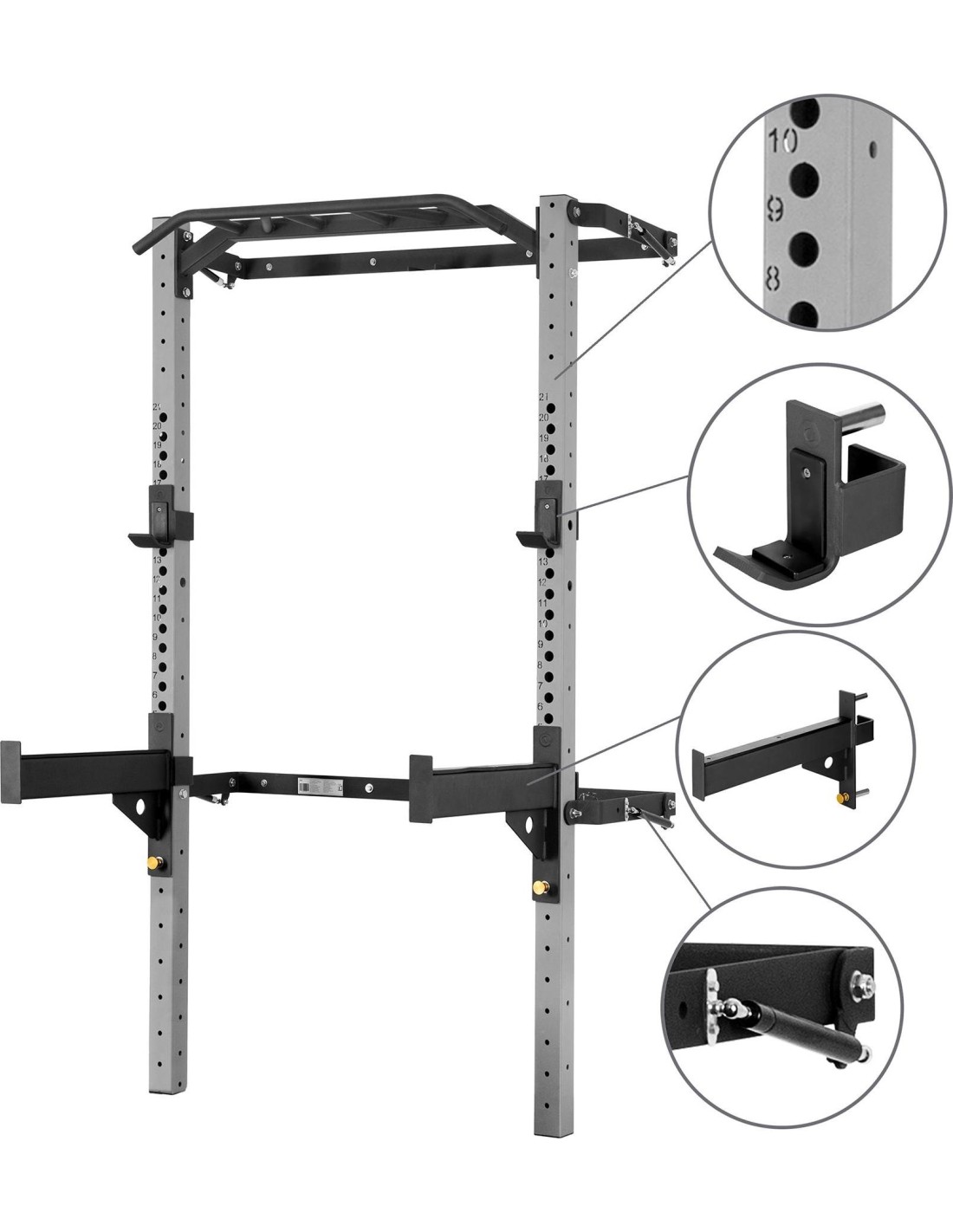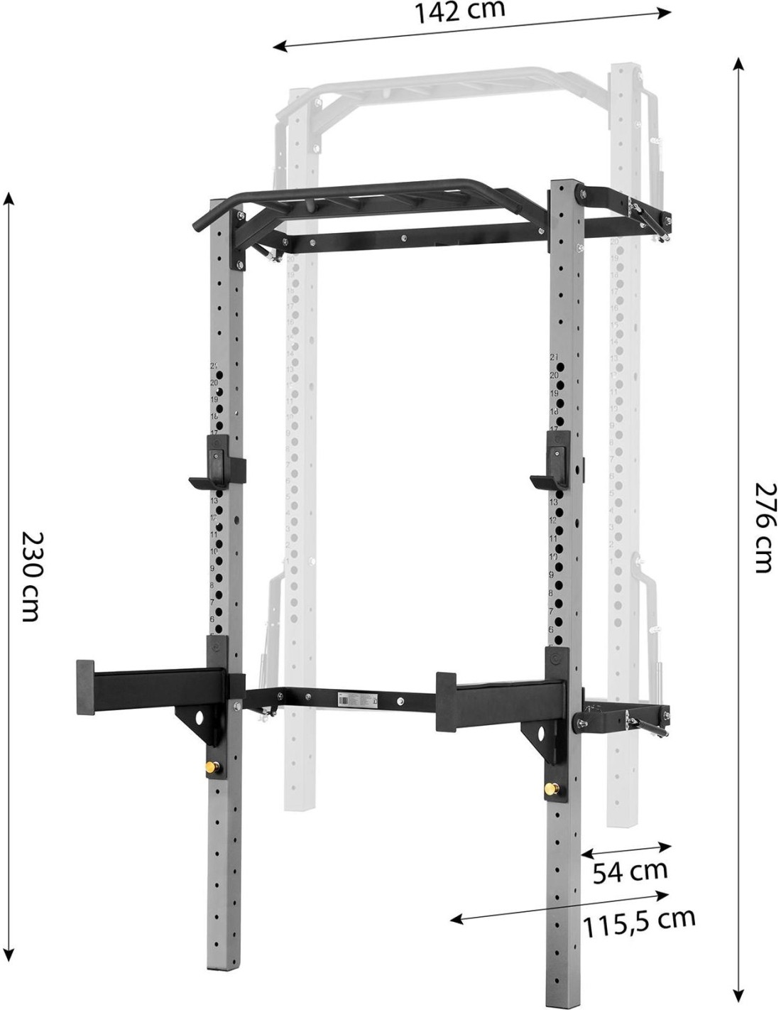 The cage has a multifunctional pull-up bar that allows you to develop your back, shoulder and chest muscles thanks to the different grip options. Pull-ups are one of the best exercises for the upper body, as they engage multiple muscle groups and improve joint mobility. To simplify this exercise, simply use special resistance bands. On the KLT23 you will also find two griffin hooks that you can mount at any height.